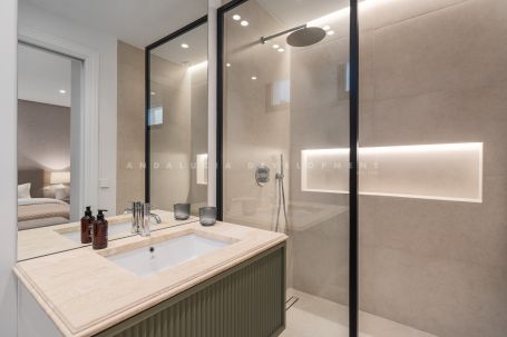 An exceptional villa within La Cerquilla, an esteemed neighborhood in Nueva Andalucía’s renowned Golf Valley. Completed in 2023, this newly constructed villa represents a harmonious blend of modern design and classical influences inspired by French provincial architecture. Its expansive 475 square meters of built area, along with a refined 78 square meter terrace, offer ample space for relaxation and alfresco dining. The villa offers five luxurious bedrooms, each designed with an en-suite bathroom for enhanced privacy and comfort for family members and guests. A thoughtfully placed guest toilet serves the common areas, adding convenience during social gatherings. With a layout that skilfully balances grandeur and intimacy, Villa Valora creates a welcoming atmosphere throughout its impressive living spaces.
