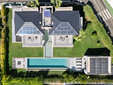 This villa is a contemporary residence in La Quinta designed for modern living and entertaining. The property offers a spacious open-plan layout with a large lounge, dining area, and fully equipped kitchen that connect seamlessly to the outdoors through floor-to-ceiling glass doors. The exterior is centered around a generous swimming pool with surrounding sun terraces, a poolside lounge with firepit, and multiple covered seating areas. The pool features a retractable cover to ensure year-round use, while an outdoor kitchen and dining space provide an ideal setup for gatherings. Inside, the villa includes well-appointed bedrooms with private terraces and modern finishes, along with a cinema-style entertainment room featuring a bar, pool table, and large projector screen. The property is equipped with an air source heat pump, solar panels with battery storage, and a Domotica Smart Home system, ensuring energy efficiency and modern comfort throughout. Combining clean architecture with practical features, this villa delivers a complete lifestyle property in one of Marbella’s most desirable areas