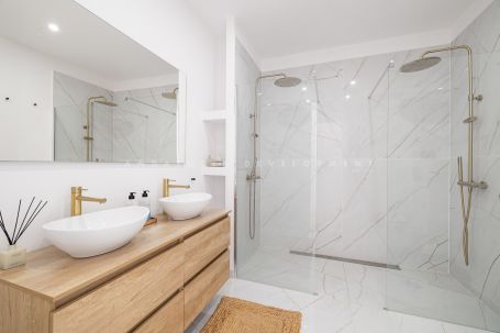 Designed in a contemporary Scandinavian style, the home features oak wood flooring, a bright and airy open-plan layout, and abundant natural light streaming through expansive windows. The spacious living areas are complemented by an advanced Airzone climate control system and partial underfloor heating, ensuring year-round comfort. High-quality designer furniture is included, making this property move-in ready. Every terrace of the penthouse faces south and boasts spectacular panoramic views of the Mediterranean Sea, providing an exceptional setting for relaxation or entertaining. The master bedroom includes an en-suite bathroom and direct access to the main terrace, where the sea views become part of your everyday living experience.