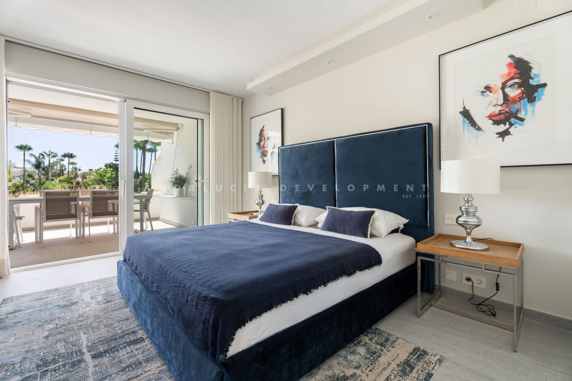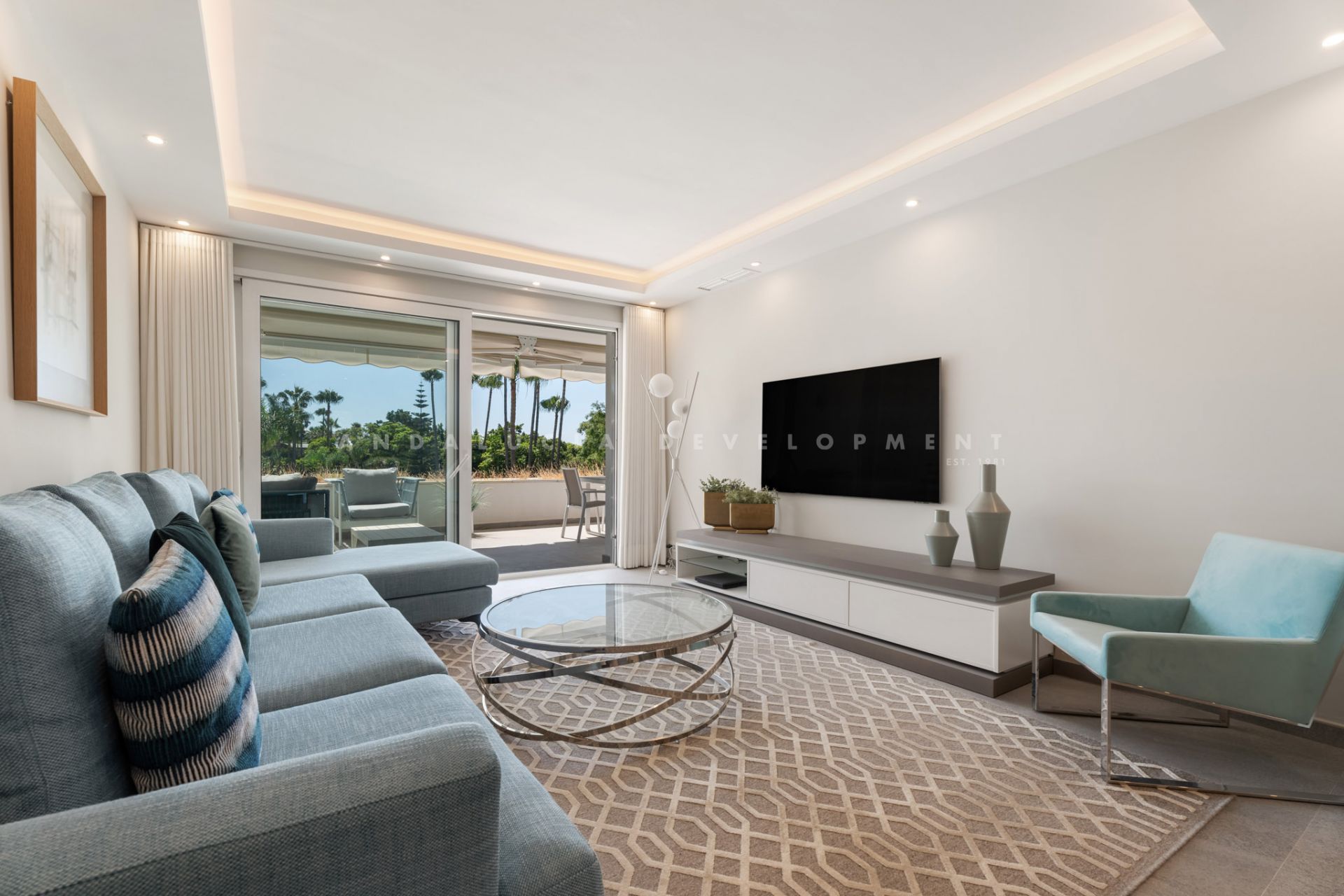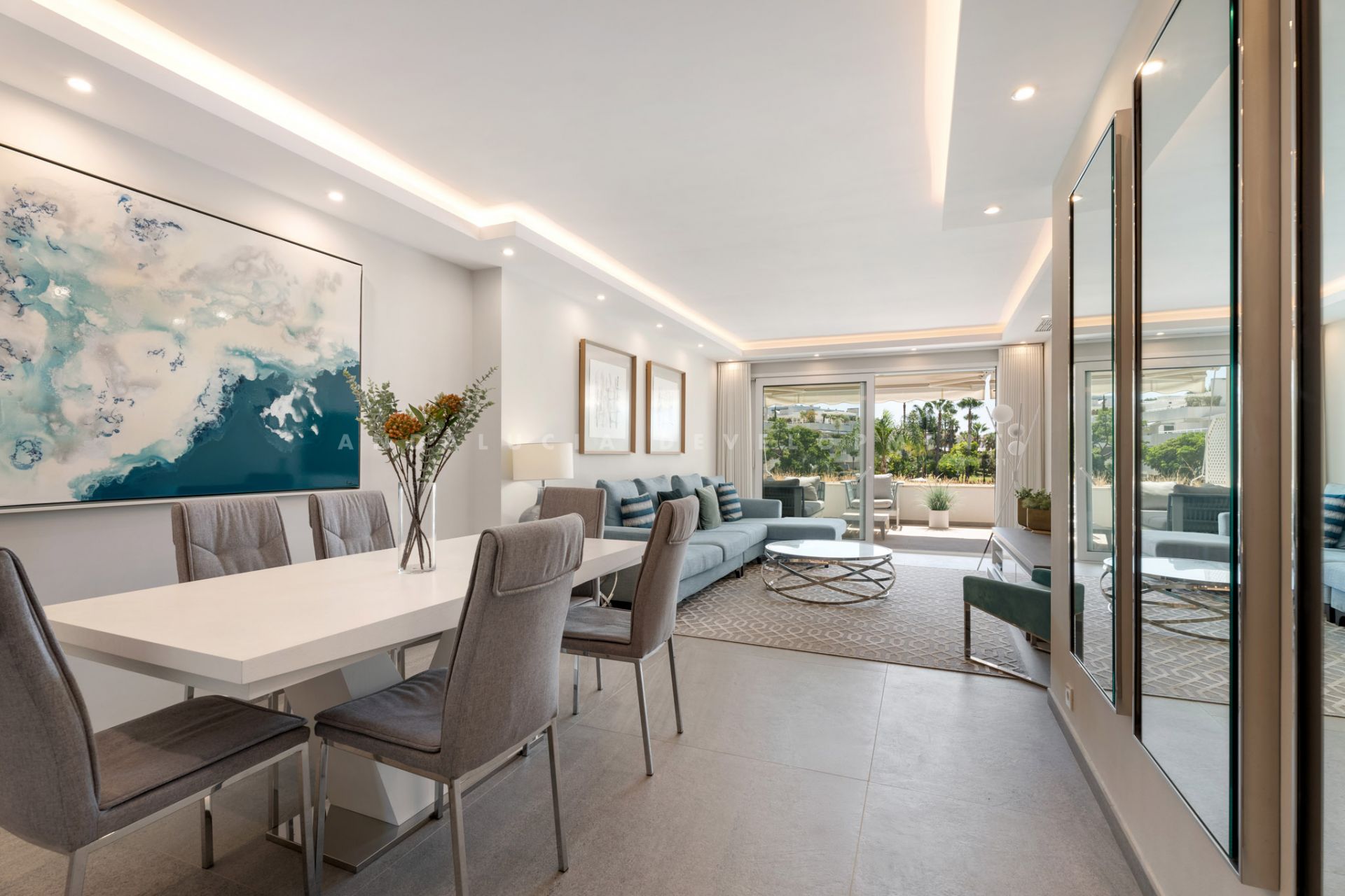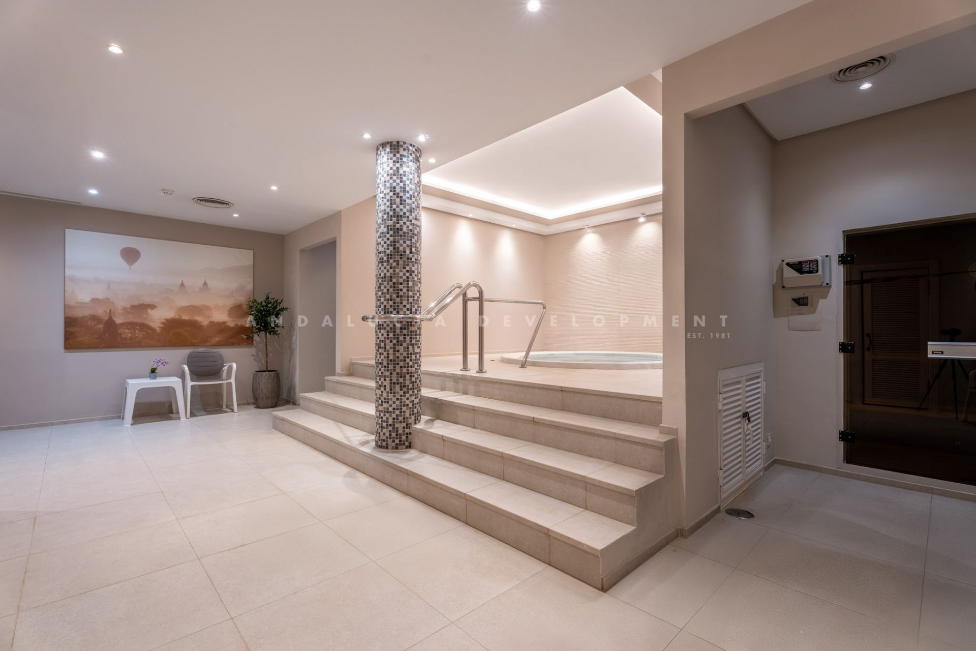 Nestled in the heart of Nueva Andalucía, within the sought-after community of Los Granados Golf, this elegant middle-floor apartment seamlessly blends modern sophistication with Mediterranean charm. Recently renovated and presented in turnkey condition, the property offers a generous 120 m² of beautifully designed living space. The open-plan layout includes two spacious bedrooms, two stylish bathrooms plus a separate guest toilet, and a sleek, fully fitted kitchen that flows effortlessly into the bright living and dining area. Offered fully furnished, this home is ready for immediate enjoyment. A standout feature is the spacious 36 m² terrace, perfect for alfresco dining, relaxing, or entertaining under the Marbella sun, with tranquil views overlooking lush tropical gardens and a sparkling communal pool. Residents of this exclusive gated community enjoy a wealth of premium amenities, including manicured gardens, a beautiful outdoor pool, a newly built indoor heated pool, jacuzzi, sauna, gym, and 24-hour security for complete peace of mind. Additional conveniences include lift access, private underground parking, and a dedicated storage room. The primary suite boasts fitted wardrobes and an elegant en-suite bathroom, while the second bedroom is ideally positioned near the second bathroom, perfect for family living or hosting guests. Ideally situated, overlooking Las Brisas Golf course and just moments away from renowned golf courses, as well as Marbella’s vibrant town centre, stunning beaches, top restaurants, and upscale shopping, this residence offers not only a luxurious lifestyle but also excellent investment potential in the heart of Nueva Andalucia.
