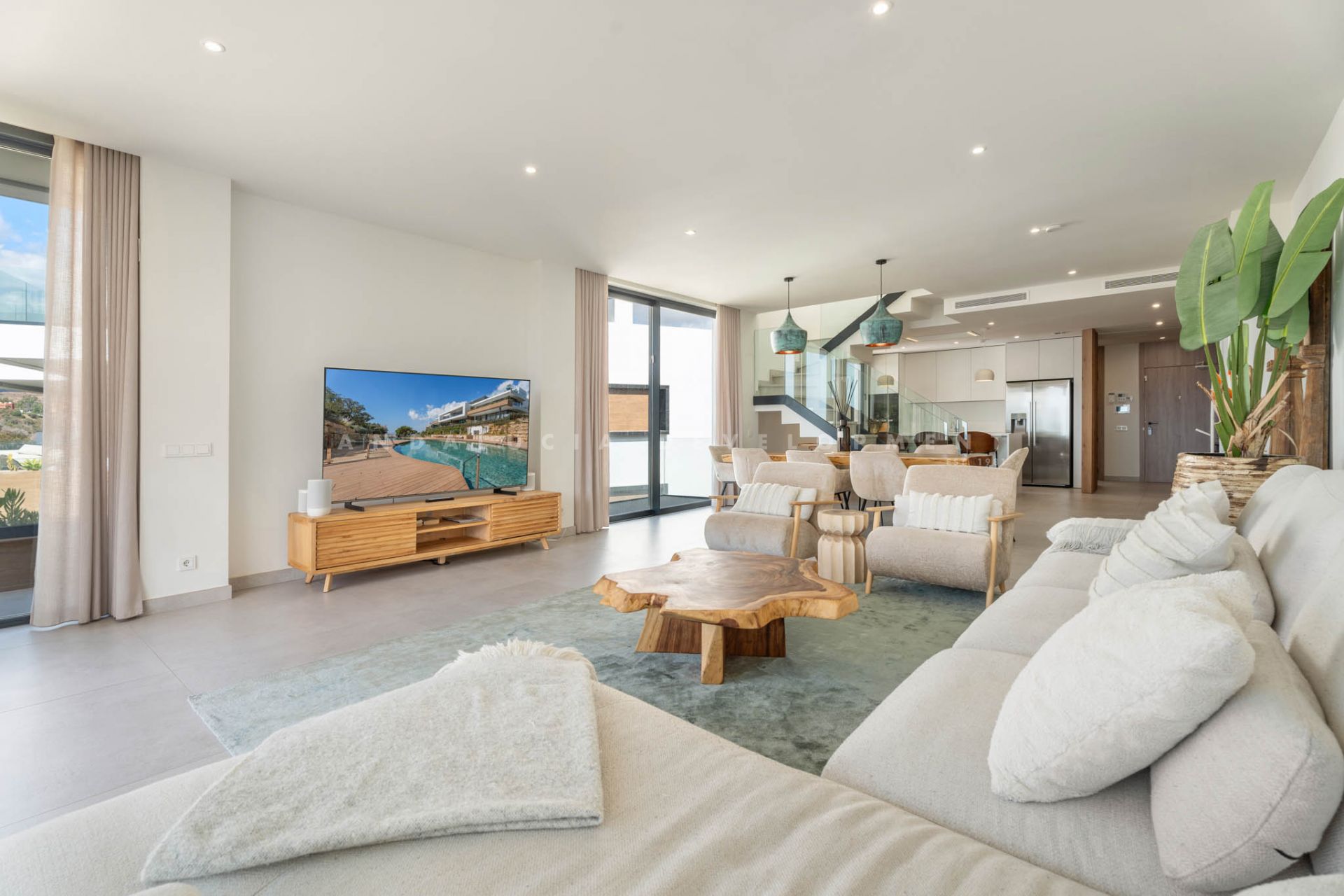 This contemporary duplex penthouse in Marbella East is thoughtfully designed across two levels, combining modern architecture with well-defined living spaces. Every detail has been considered to maximize natural light, seamless indoor-outdoor living, and privacy. The main floor opens to a spacious living and dining area with direct access to a large terrace that frames the home with Mediterranean views. Floor-to-ceiling windows create a fluid transition between the interior and exterior. The modern kitchen, with a functional and balanced layout, serves as the central hub of the residence. On this level, three bedrooms are arranged for comfort and privacy. The primary suite and one guest bedroom, both with en-suite bathrooms, are located in a private night area. The primary suite also features a dressing area and direct terrace access. A third guest bedroom with fitted wardrobes is complemented by a separate full bathroom. The upper floor introduces an additional living space that opens onto the solarium, an elevated retreat featuring a private pool and expansive terraces with panoramic views of the Mediterranean Sea. This space is ideal for outdoor relaxation, dining, and entertaining. The orientation of the property ensures a harmonious balance of light and shade throughout the day, while the terraces provide multiple outdoor living areas that enhance the contemporary design.