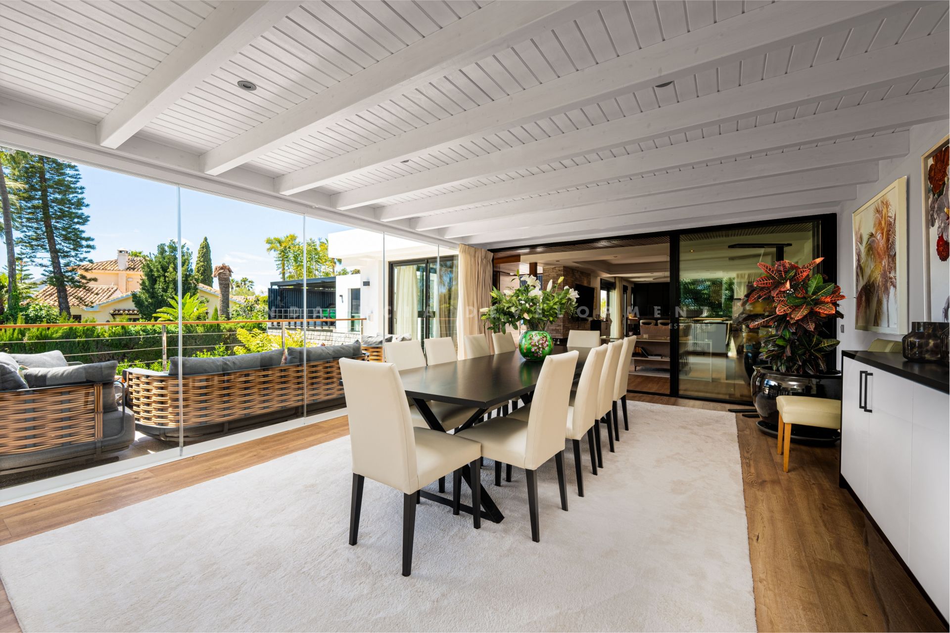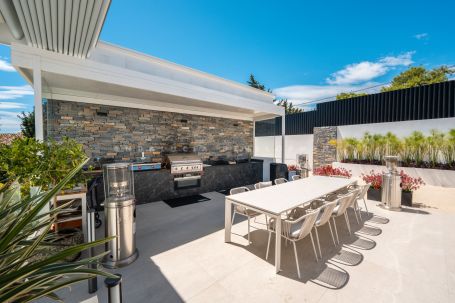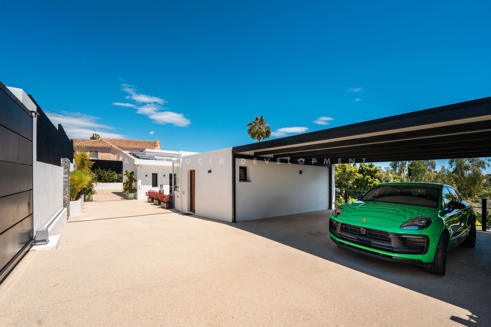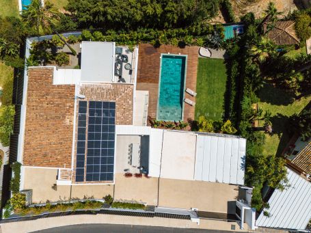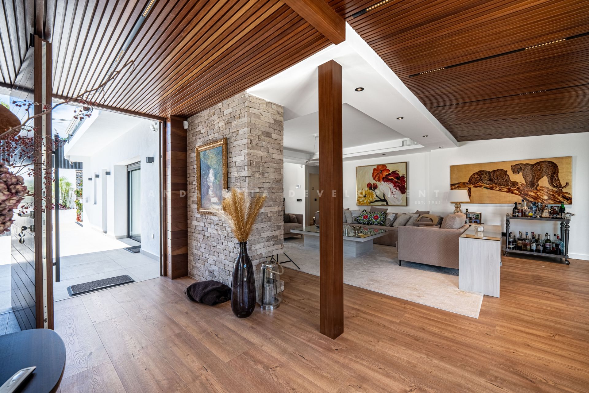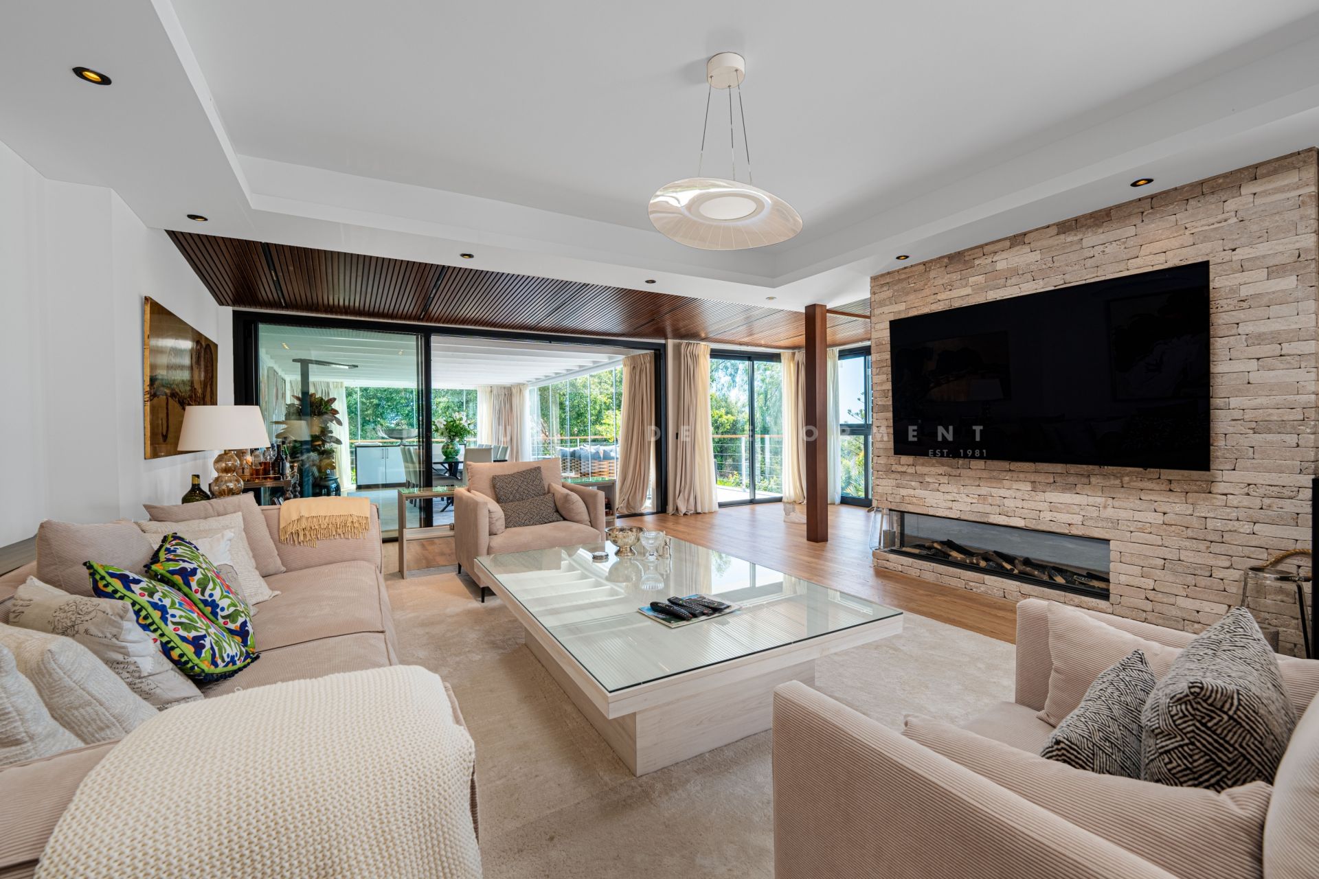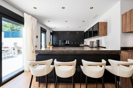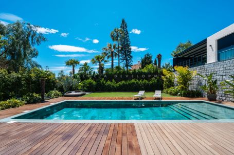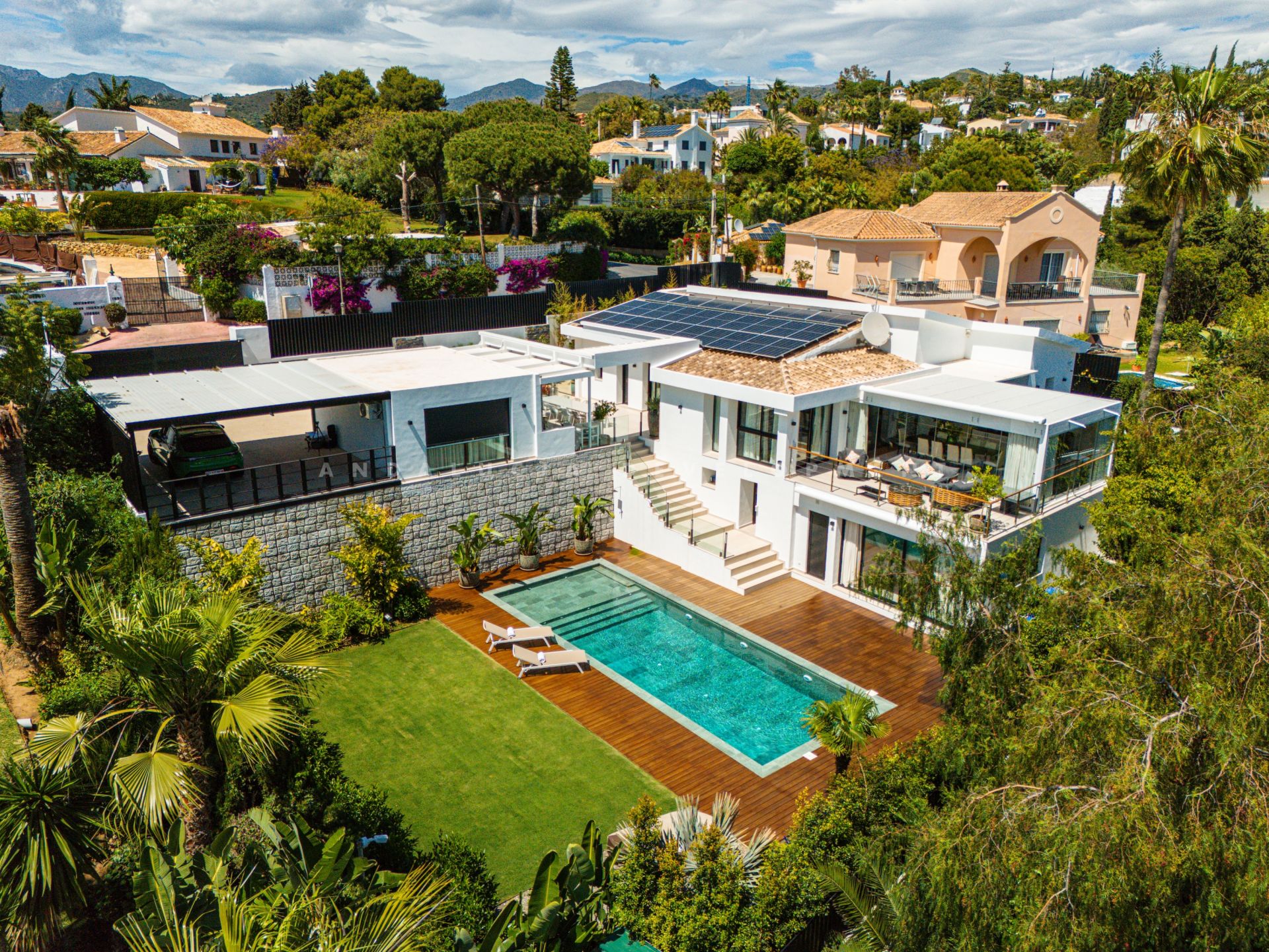 This villa is a newly refurbished five-bedroom villa offering privacy, comfort and refined modern living. Set on a 1,065 m² plot surrounded by mature trees, this home combines open-plan design with seamless indoor-outdoor flow. The main living area connects the kitchen, dining and lounge spaces, all opening to large terraces that overlook the gardens and pool. Every detail has been finished to a high standard with sleek materials and natural light throughout. The designer kitchen features premium Gaggenau appliances, a semi-island breakfast bar and access to a covered terrace with an outdoor kitchen and dining area. Three bedrooms sit on the main floor, two with en-suite bathrooms and walk-in wardrobes. The lower level includes two independent guest apartments, a climate-controlled wine cellar and private access to the gardens. Each space offers comfort, functionality and a calm, elegant style. Outside, a private pool is framed by wooden decking and shaded lounge areas. This villa also includes underfloor heating, solar power, parking for several vehicles and a newly built guest house with panoramic views. The property combines modern design with complete privacy, creating an ideal retreat for buyers seeking a secure, sophisticated lifestyle in a prime location.