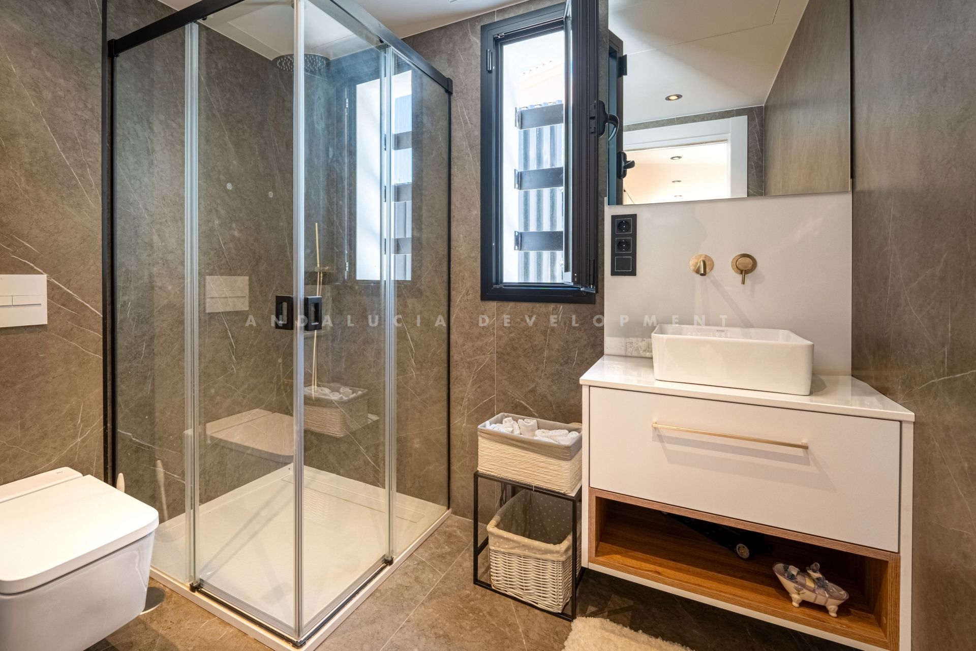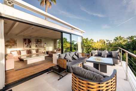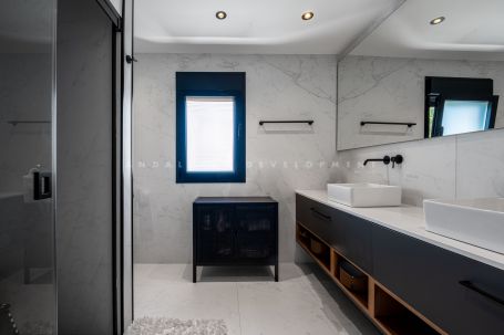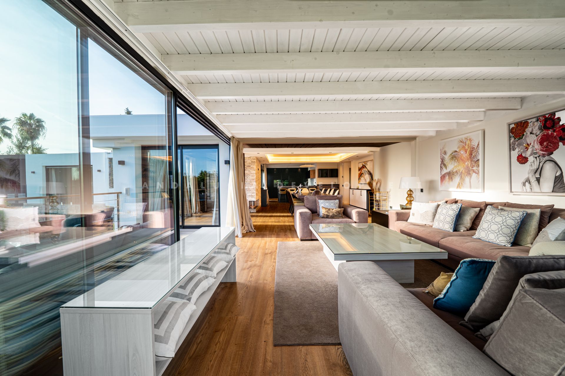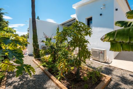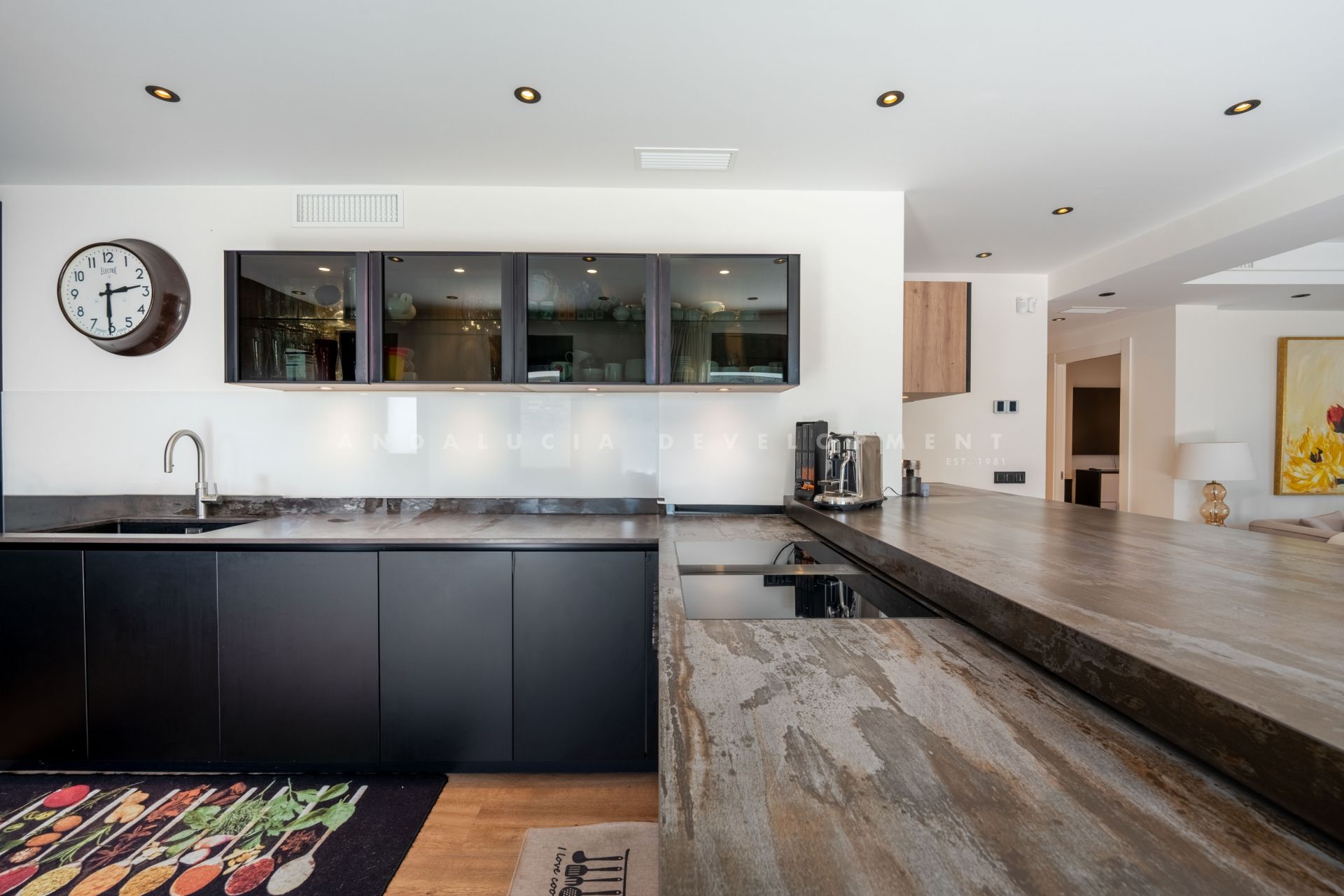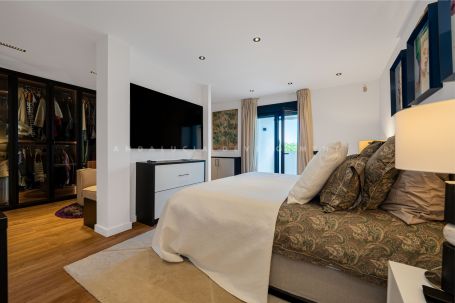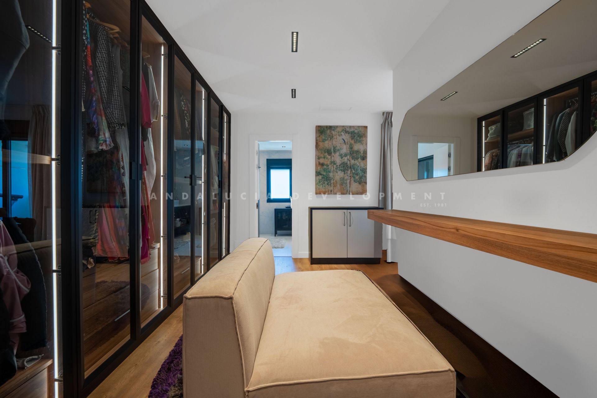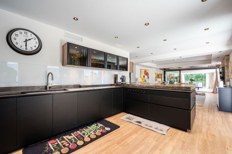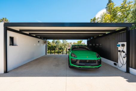 This villa is a newly refurbished five-bedroom villa offering privacy, comfort and refined modern living. Set on a 1,065 m² plot surrounded by mature trees, this home combines open-plan design with seamless indoor-outdoor flow. The main living area connects the kitchen, dining and lounge spaces, all opening to large terraces that overlook the gardens and pool. Every detail has been finished to a high standard with sleek materials and natural light throughout. The designer kitchen features premium Gaggenau appliances, a semi-island breakfast bar and access to a covered terrace with an outdoor kitchen and dining area. Three bedrooms sit on the main floor, two with en-suite bathrooms and walk-in wardrobes. The lower level includes two independent guest apartments, a climate-controlled wine cellar and private access to the gardens. Each space offers comfort, functionality and a calm, elegant style. Outside, a private pool is framed by wooden decking and shaded lounge areas. This villa also includes underfloor heating, solar power, parking for several vehicles and a newly built guest house with panoramic views. The property combines modern design with complete privacy, creating an ideal retreat for buyers seeking a secure, sophisticated lifestyle in a prime location.