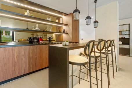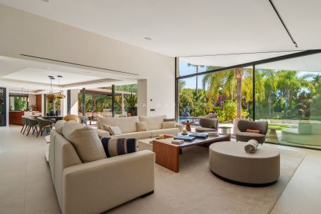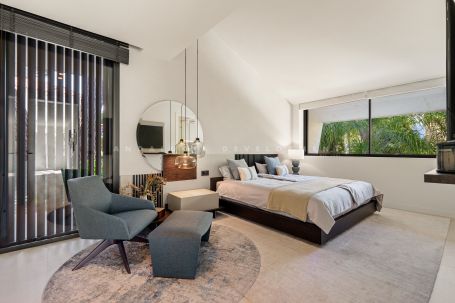 This villa is a contemporary villa located in Las Chapas, Marbella East, designed across a main level with the addition of a basement level for leisure and entertainment. The layout is centred on open-plan living, with expansive glass sliding doors that connect the interior seamlessly with the outdoor areas. The main living space integrates a lounge, dining, and kitchen area, all finished with clean lines, warm wood accents, and views toward the landscaped garden and pool. The villa includes well-designed guest bedrooms and a spacious master suite, each opening to greenery and natural light. The master features a large ensuite bathroom with a freestanding tub and double vanity, separated by architectural wooden detailing that adds privacy while maintaining openness. The bedrooms are complemented by modern finishes and large windows that enhance the sense of connection to the surrounding gardens. On the lower level, an entertainment room provides a comfortable space for gatherings. It features a lounge area, bar, and pool table, making it ideal for informal relaxation or social evenings. This additional level ensures the villa maintains a one-floor living concept while offering the benefit of dedicated leisure areas.