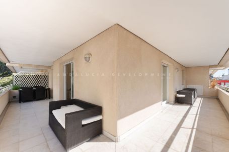Ideally located 2-bedroom, 2-bathroom apartment situated in the popular urbanisation of Marina Banus. Being situated on a corner you have a wraparound terrace and plenty of light. The convenient access to the apartment is either through the garage or pedestrian main entrance. The complex has 24-hour security, a nice communal pool area and a padel court. If you are looking for a centrally located apartment in a safe and well-run community, this is it.
