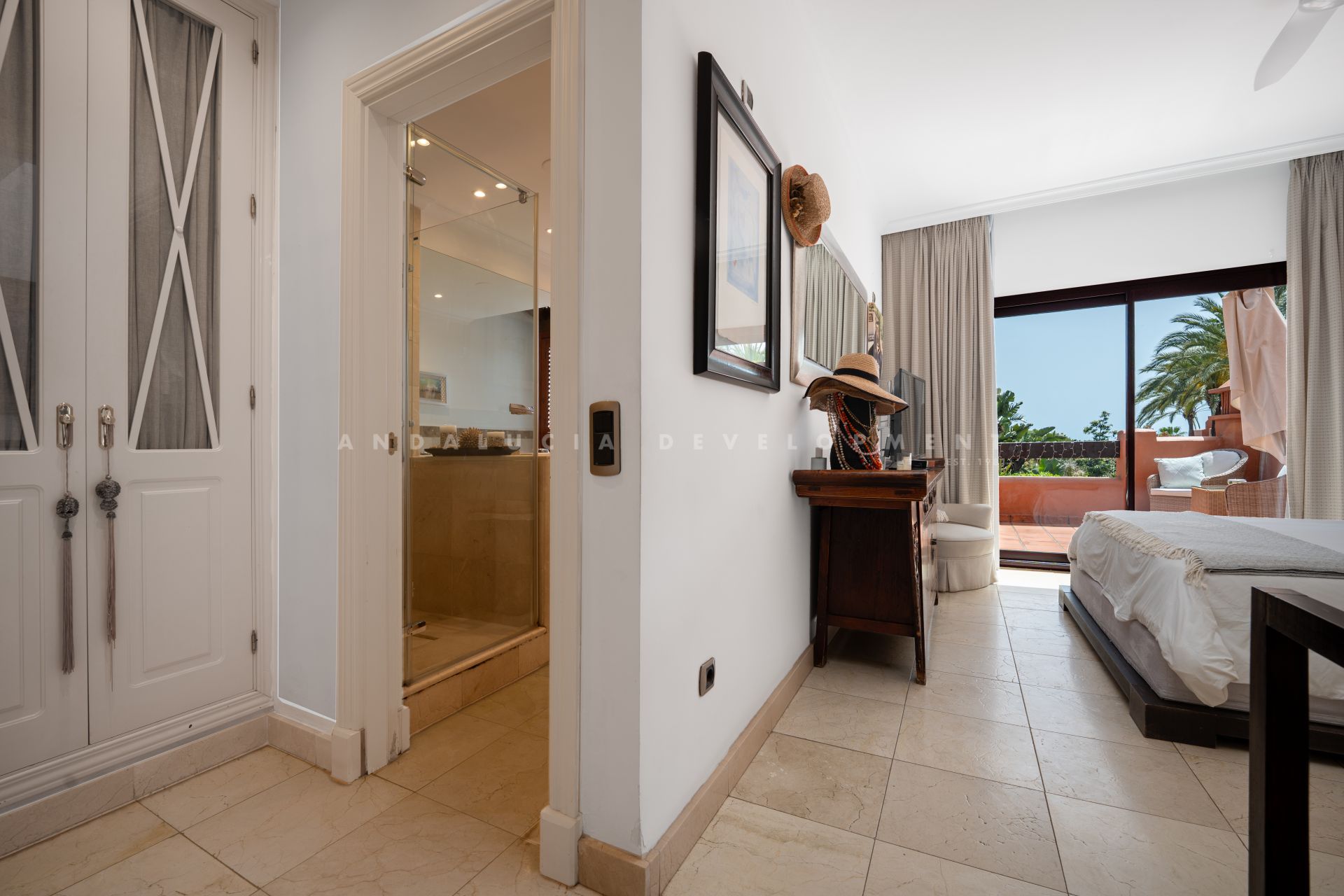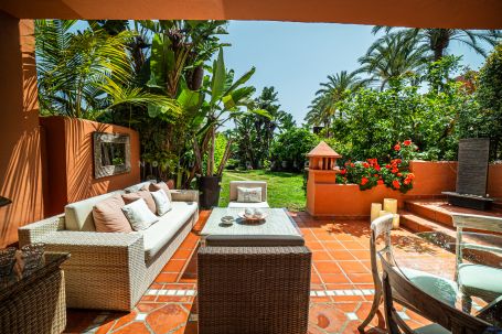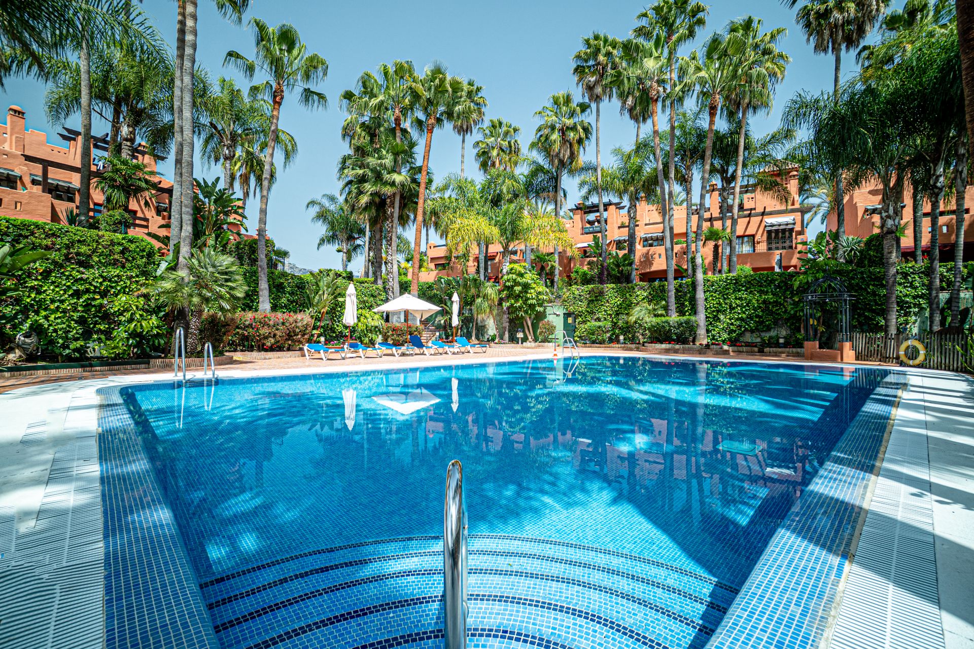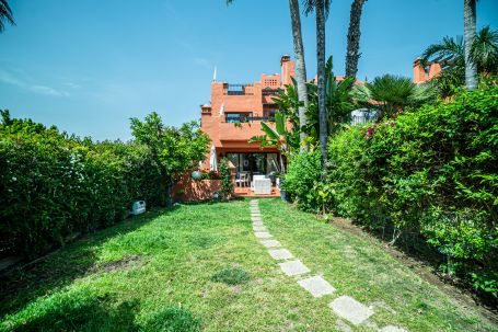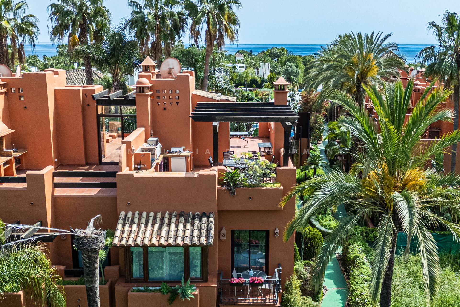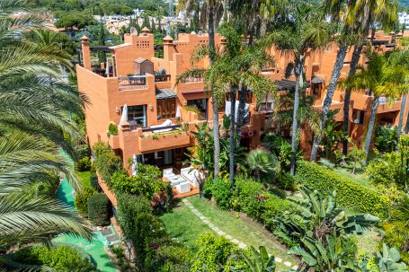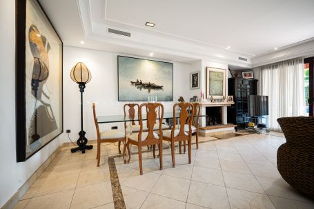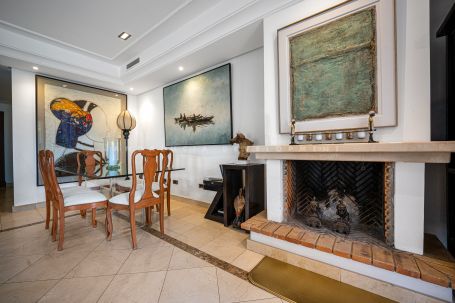 This townhouse is a five-bedroom luxury home in one of Marbella’s most prestigious gated communities on the Golden Mile. Surrounded by tropical gardens, this townhouse offers privacy, comfort, and Mediterranean charm. With multiple terraces, a private garden, and a rooftop solarium, it combines outdoor living with elegant interior spaces, making it ideal for families or buyers looking for a secure retreat close to the beach and amenities. Inside, the living area is bright and inviting with large windows, a fireplace, and direct access to the terraces. The kitchen is modern and practical with high-end appliances and access to the outdoor dining area. The master suite includes an en-suite bathroom with a bathtub overlooking the gardens, while additional bedrooms feature private terraces and mountain views. The lower level provides two en-suite bedrooms, a laundry room, and garage access, with the option to create a self-contained guest apartment. With panoramic views of La Concha and the Mediterranean Sea from the rooftop, this townhouse offers the perfect balance of luxury, functionality, and location in Marbella’s Golden Mile.