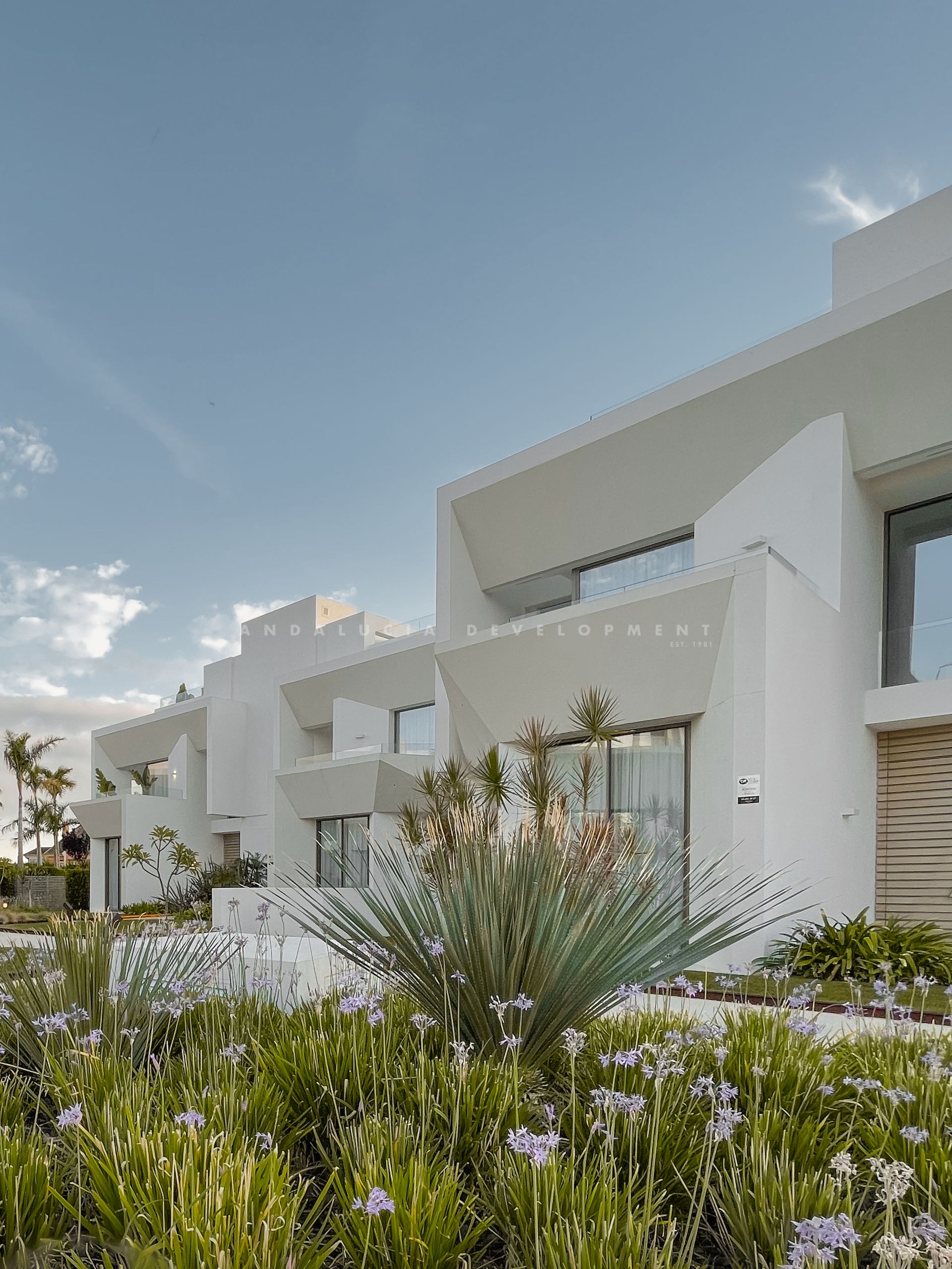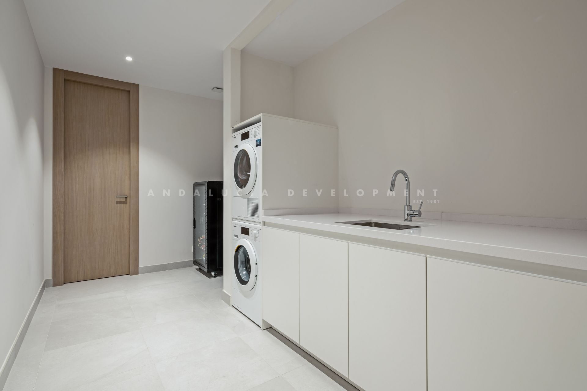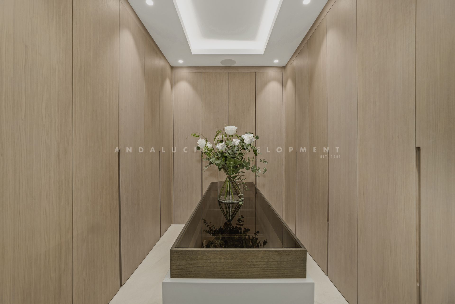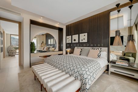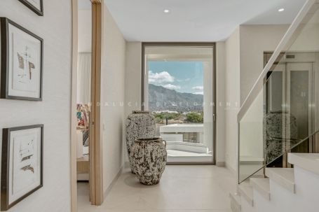 Located in a secure community in Nueva Andalucía, this modern architectural gem shines with its clean lines, captivating geometric exterior, and elegant natural materials in soothing neutral tones. The property invites you to enjoy the outdoors with a covered terrace perfect for dining and relaxing. A custom-designed solarium with a private pool offers breathtaking panoramic views of the valley, La Concha, the Mediterranean Sea, and Gibraltar. Spread over four floors, this exceptional home includes four bedrooms, each with an en-suite bathroom, a high-end kitchen, and underfloor heating for ultimate comfort. A private garage with space for up to three cars ensures unparalleled convenience. The development also features a large, beautifully designed communal swimming pool, offering a serene space to relax and enjoy the Mediterranean climate. This modern home also offers easy access to local amenities and essential services. Furthermore, it is being delivered fully furnished, with an interior design by JA-Flores. We invite you to immerse yourself in the luxury of living in Marbella with this extraordinary property.
