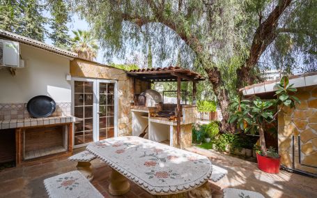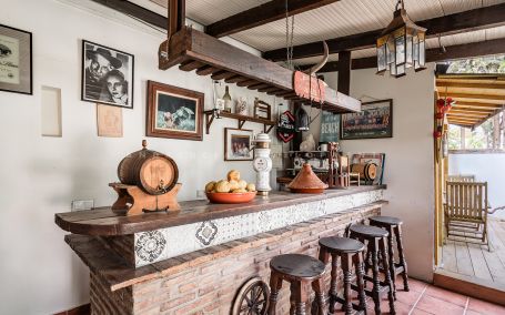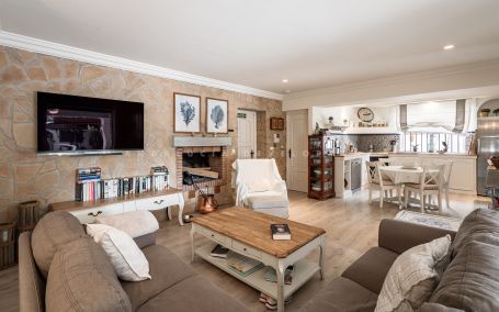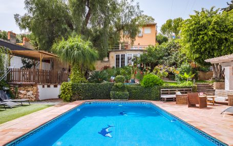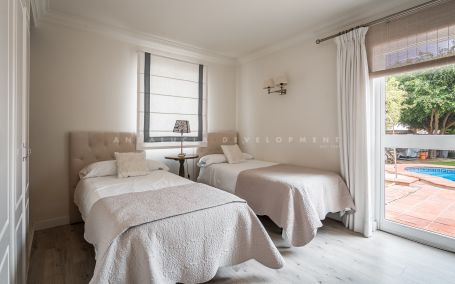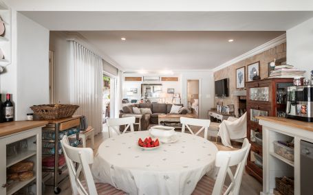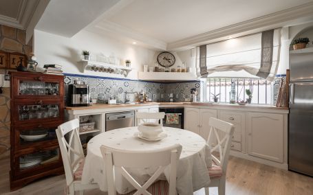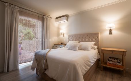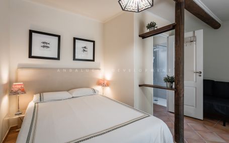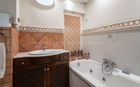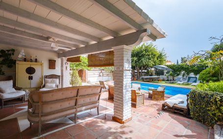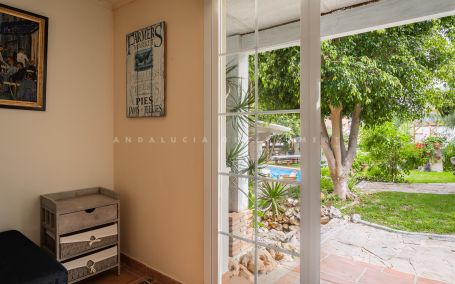 Traditional Andalusian-style property located in the heart of Nueva Andalucía, in a quiet area, yet with easy access by car or even on foot to all kinds of amenities, the beach and Puerto Banús. The property consists of a main house comprising of a living/dining room with open-plan fully fitted and equipped kitchen, leading to the porch, an open terrace and the garden with swimming pool. In the house are also two bedrooms with two complete bathrooms. In the garden, there are two separate bedrooms with separate entrance, making them ideal for guests. One of them has an en-suite bathroom and the other one a separate bathroom.