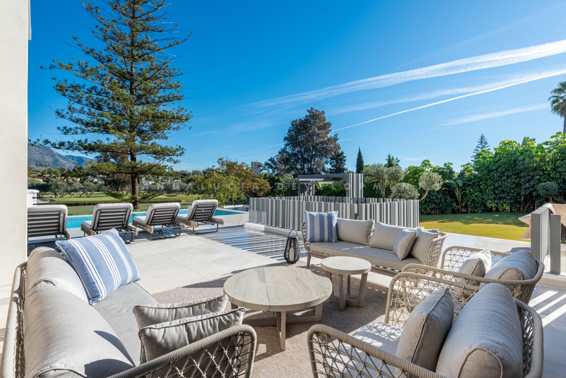 The kitchen is a showpiece, equipped with top-of-the-range appliances, generous storage, and a large central island perfect for casual meals and entertaining. It flows seamlessly to the outdoor terraces, where an infinity pool, jacuzzi, and various lounging areas overlook the manicured greens of Las Brisas. Outdoor amenities also include a fire pit and a covered area designed for an outdoor kitchen—ideal for alfresco dining year-round.