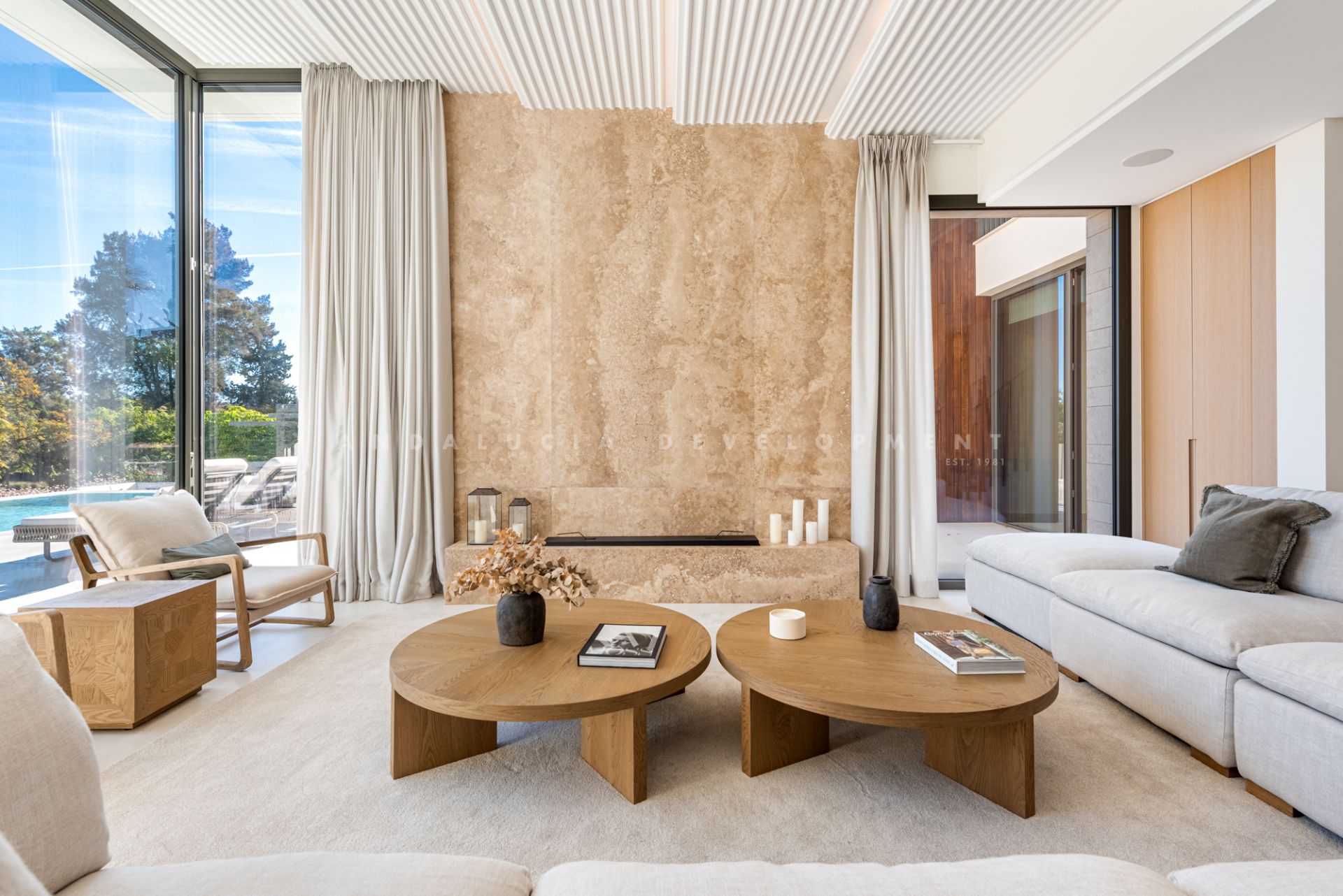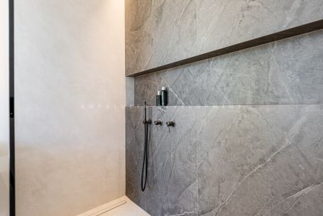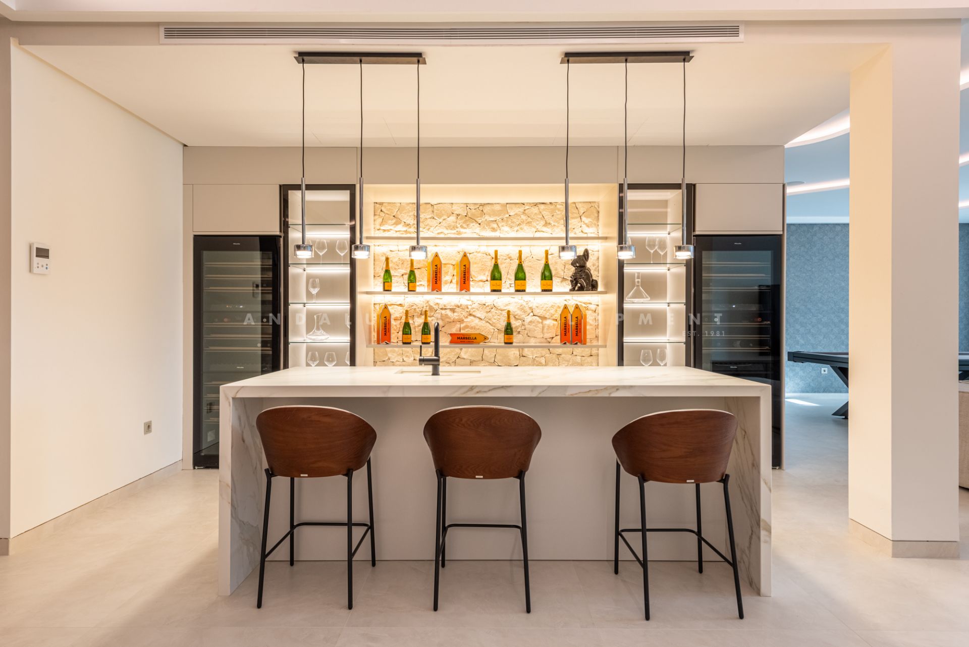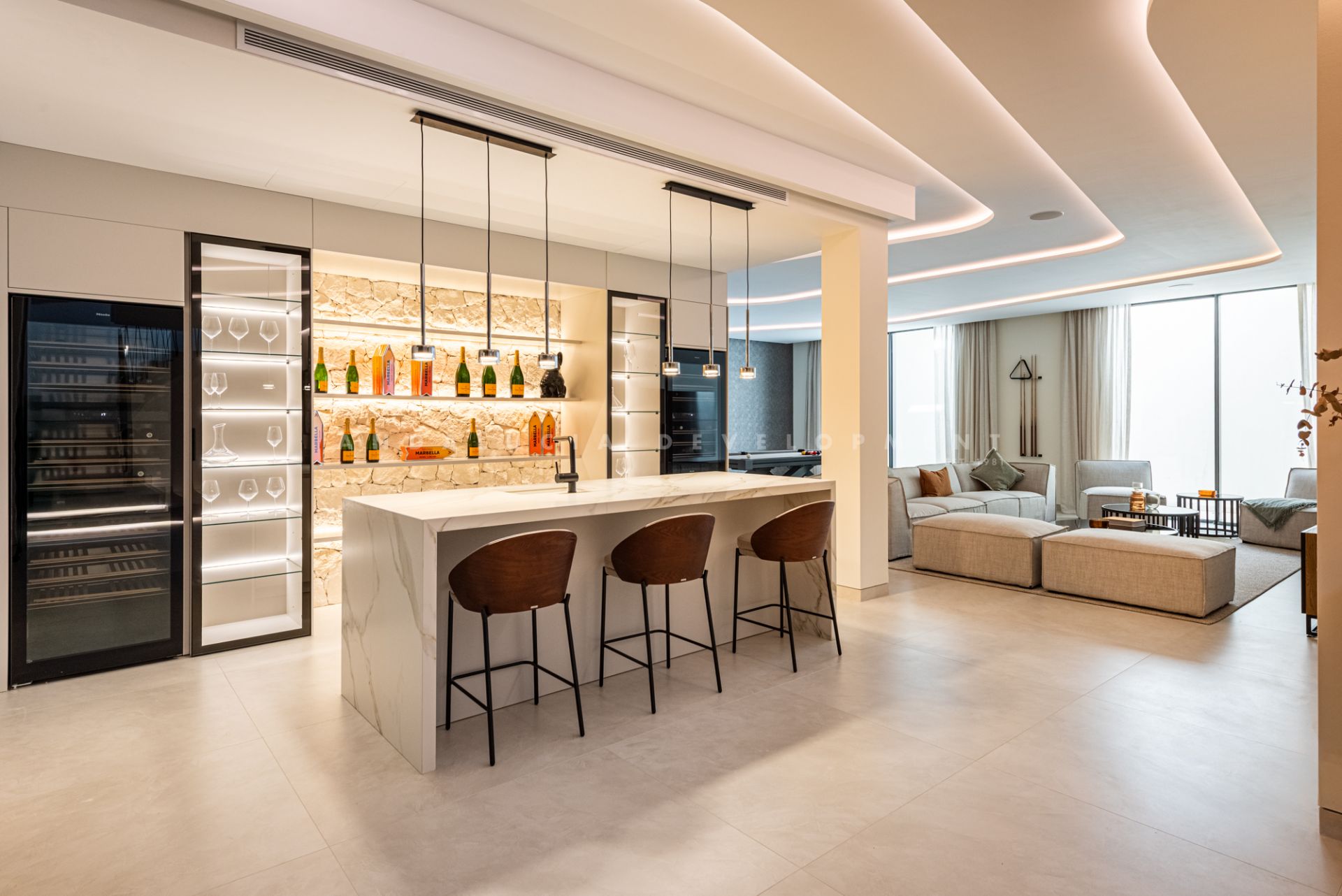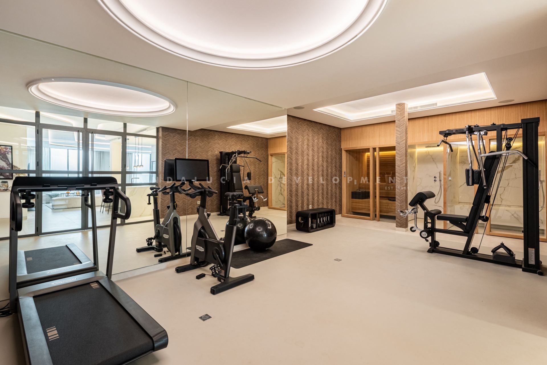 The lower level is designed as a luxurious leisure and wellness retreat. It includes a fully equipped TechnoGym, a sauna, and a steam room, along with a second lounge illuminated by large windows that bring in abundant natural light. This level also hosts a stylish bar with a stone-clad backsplash, a home cinema, and additional bedrooms—creating a versatile space perfectly suited for entertainment or relaxation.