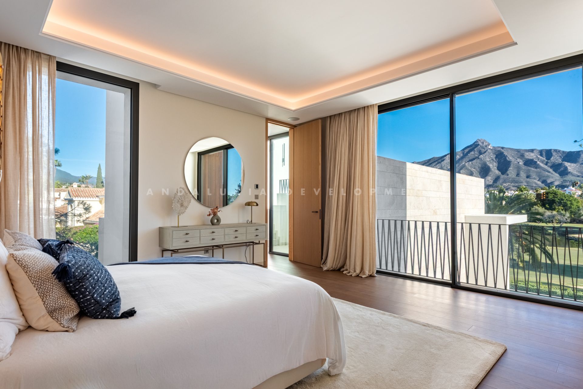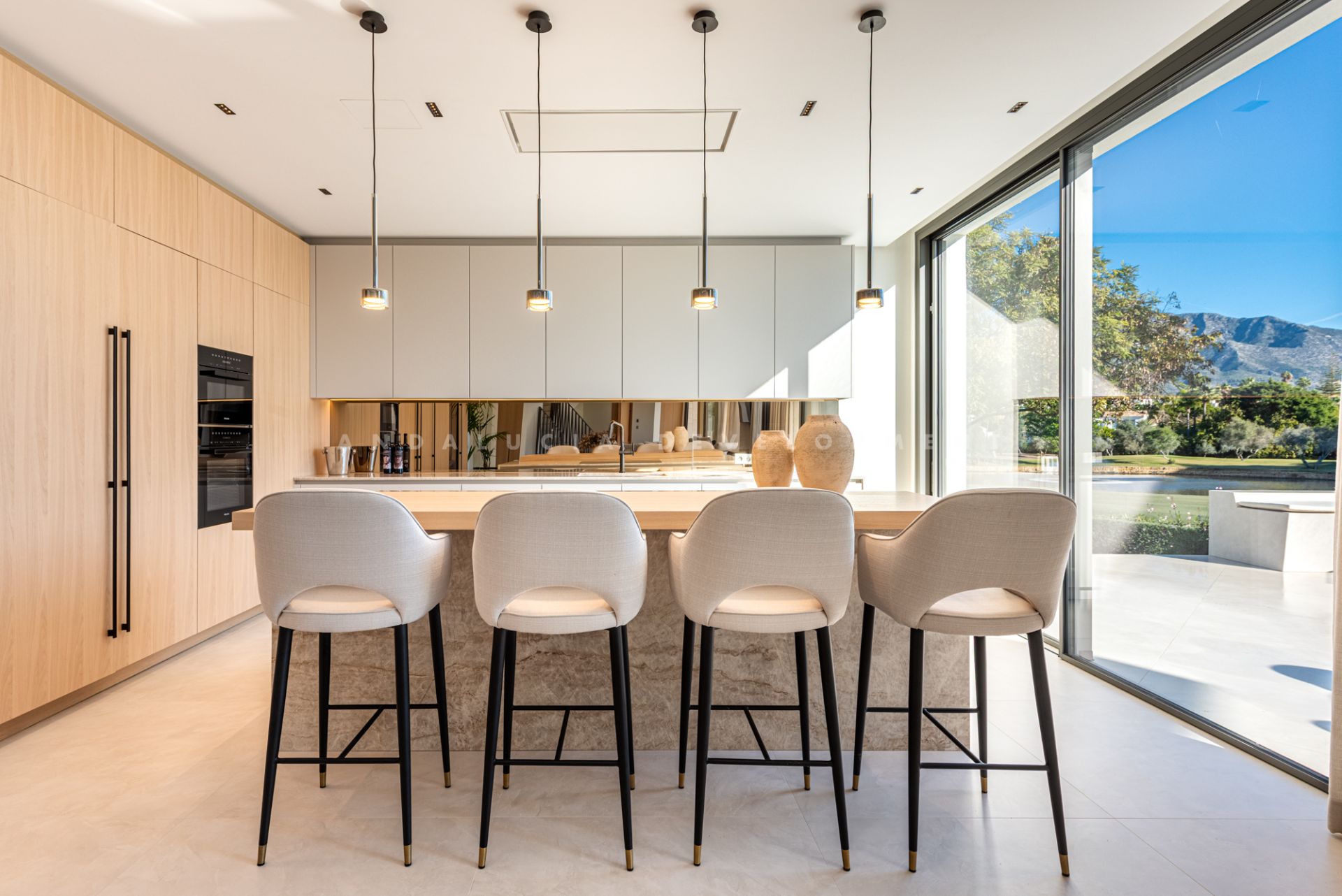 Upon entering, you are greeted by a warm, elegant interior where modern and rustic elements blend harmoniously. A grand archway, leaded windows, and beautifully crafted wooden doors add character and charm. The open-plan living area is both stylish and functional, highlighted by floor-to-ceiling windows that frame panoramic views of La Concha mountain, the golf course, and the tranquil lake. Discreet LED accents further enhance the cozy atmosphere.