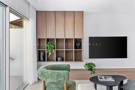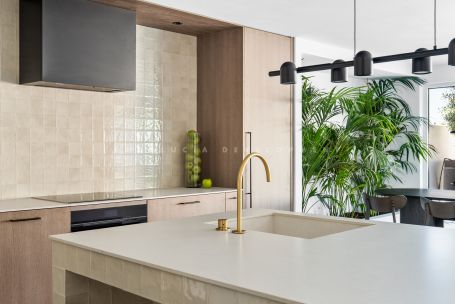 This property is a perfect for year-round living or a holiday home. The combination of earthy colors, matte black, smoked oak wood, gold touches and unique zellige tiles creates a refined look of the property. Upon entering the townhouse, you’re greeted by a distinctive staircase made of wood and metal, seamlessly merging traditional and modern styles. Right from the entrance the home opens up to the kitchen, dining, and living areas, all overlooking a beautiful outdoor livingspace with a private pool, creating a close connection between the inside and outside area, which gives a peaceful and unified feeling. This townhouse is divided into two floors and features 3 bedrooms, 3 bathrooms and terrace with outdoor bathtub and lounge area. This beautiful townhouse is perfectly positioned in Nueva Andalucia within a walking distance to the beach and Puerto Banus, close to public transport, schools, restaurants and popular sport center Real Club Padel – a heaven for sports enthusiasts offering indoor and outdoor gym, padel courts, restaurant and much more.