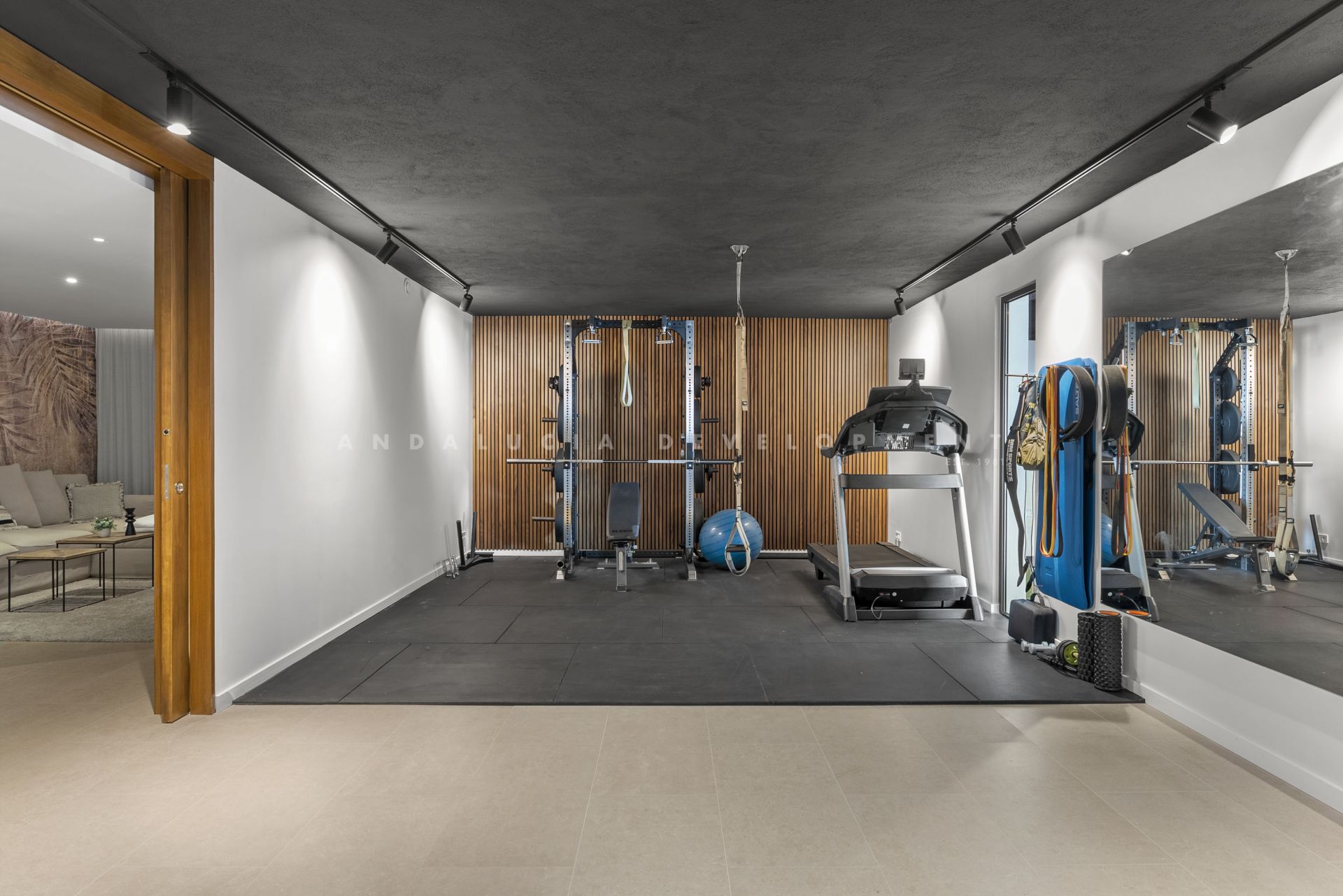 The lower level offers a guest suite with en-suite bathroom, a laundry room, a private gym, and a garage with space for at least two cars. This villa perfectly blends modern Scandinavian design with Mediterranean comfort, creating an ideal home for both permanent living and holiday enjoyment.