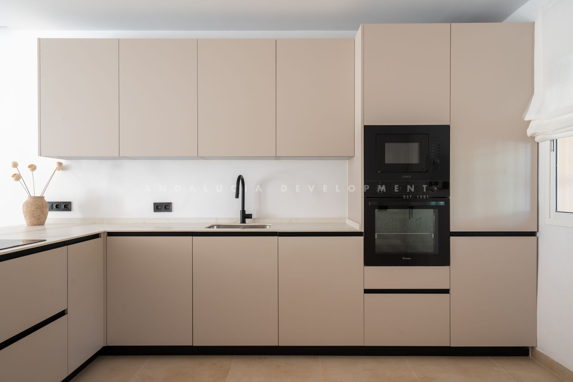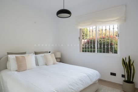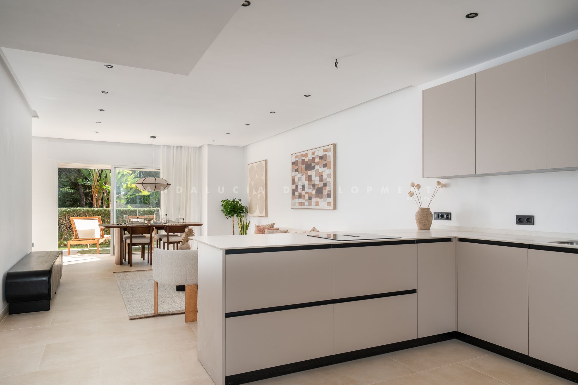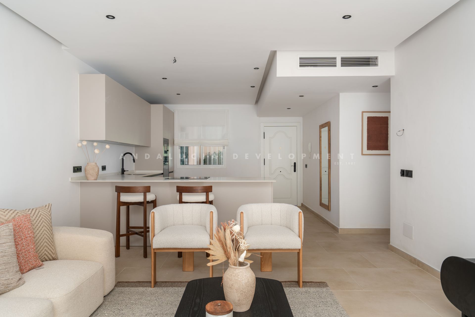 Discover this fully renovated three-bedroom, two-bathroom ground-floor apartment located within the desirable gated community of Pueblo de Las Brisas, in the prime Las Brisas area of Nueva Andalucía. The apartment features a large open-plan layout with a brand-new modern kitchen that connects seamlessly to the bright and spacious living area, creating a contemporary and comfortable environment designed by Elliott James. One of the bedrooms has been thoughtfully converted into a dedicated work-from-home office, adding flexibility for modern living. Natural light fills the interiors throughout the day, and the generous covered terrace provides the ideal space for outdoor dining and relaxing in privacy. Residents enjoy access to beautifully maintained communal gardens, a tennis court, and a swimming pool, all within this charming Andalusian-style development. Perfectly positioned close to several prestigious golf courses and just a short drive from Puerto Banús, Marbella, and San Pedro, this property is an excellent choice for year-round living or as a modern holiday home on the Costa del Sol.