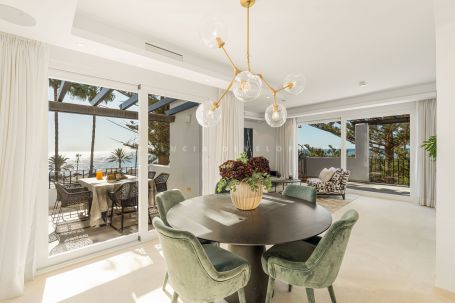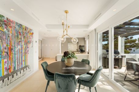 Un sofisticado ático dúplex de tres dormitorios y dos baños en venta en la exclusiva urbanización Castiglione, en San Pedro de Alcántara. Esta excepcional residencia ha sido diseñada para armonizar la estética moderna con la funcionalidad. Construida originalmente en 1985 y completamente renovada en 2019, la propiedad combina una calidad atemporal con un diseño limpio de inspiración escandinava. El ático ofrece 163 metros cuadrados de espacio interior y dos amplias terrazas que invitan a vistas panorámicas al mar Mediterráneo, al paisaje montañoso y a la piscina comunitaria, creando un ambiente tranquilo y elegante, ideal para la vida costera.