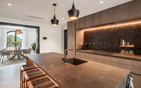 Esta lujosa villa, elegantemente renovada, ofrece un estilo de vida refinado en un exclusivo complejo cerrado y seguro. Con una atractiva orientación sur-sureste, la propiedad disfruta de impresionantes vistas al mar y abundante luz natural durante todo el día. La villa cuenta con cinco amplios dormitorios y cinco baños completos, que ofrecen amplio espacio y comodidad tanto para la familia como para los invitados. La cocina-comedor, totalmente equipada, combina funcionalidad y estilo, ideal para cenas informales, mientras que un comedor formal independiente ofrece un ambiente acogedor para el entretenimiento. El salón principal ofrece un espacio cómodo y elegante para relajarse, complementado por una versátil sala de entretenimiento que se puede adaptar a diversas actividades de ocio. La casa está equipada con calefacción por suelo radiante en toda la vivienda, así como aire acondicionado frío-calor, lo que garantiza comodidad durante todo el año. En el exterior, el jardín privado y la piscina crean un remanso de paz, perfecto tanto para momentos de tranquilidad como para reuniones sociales.