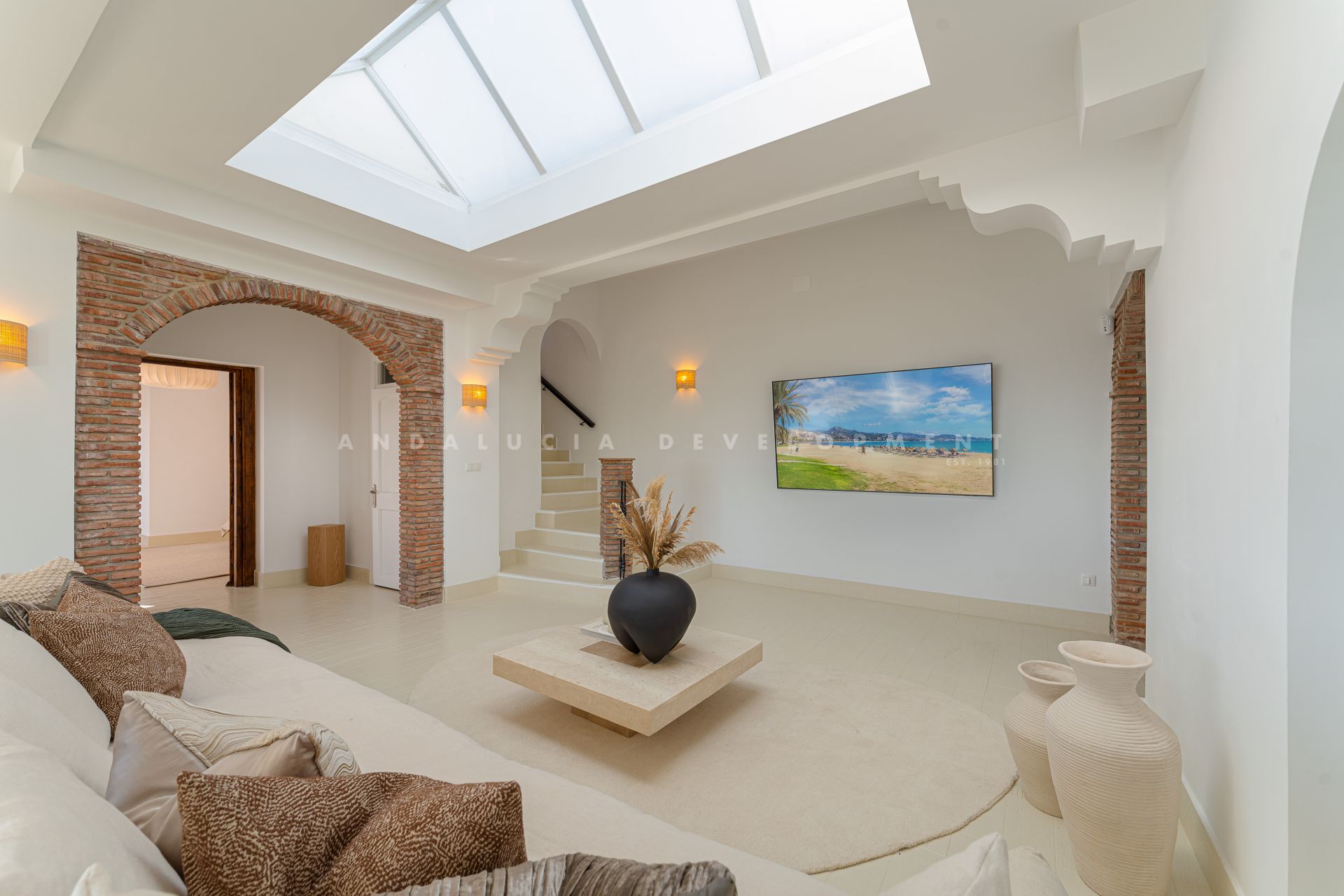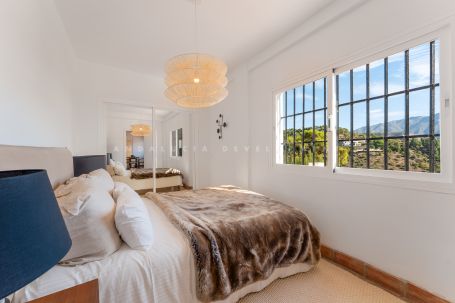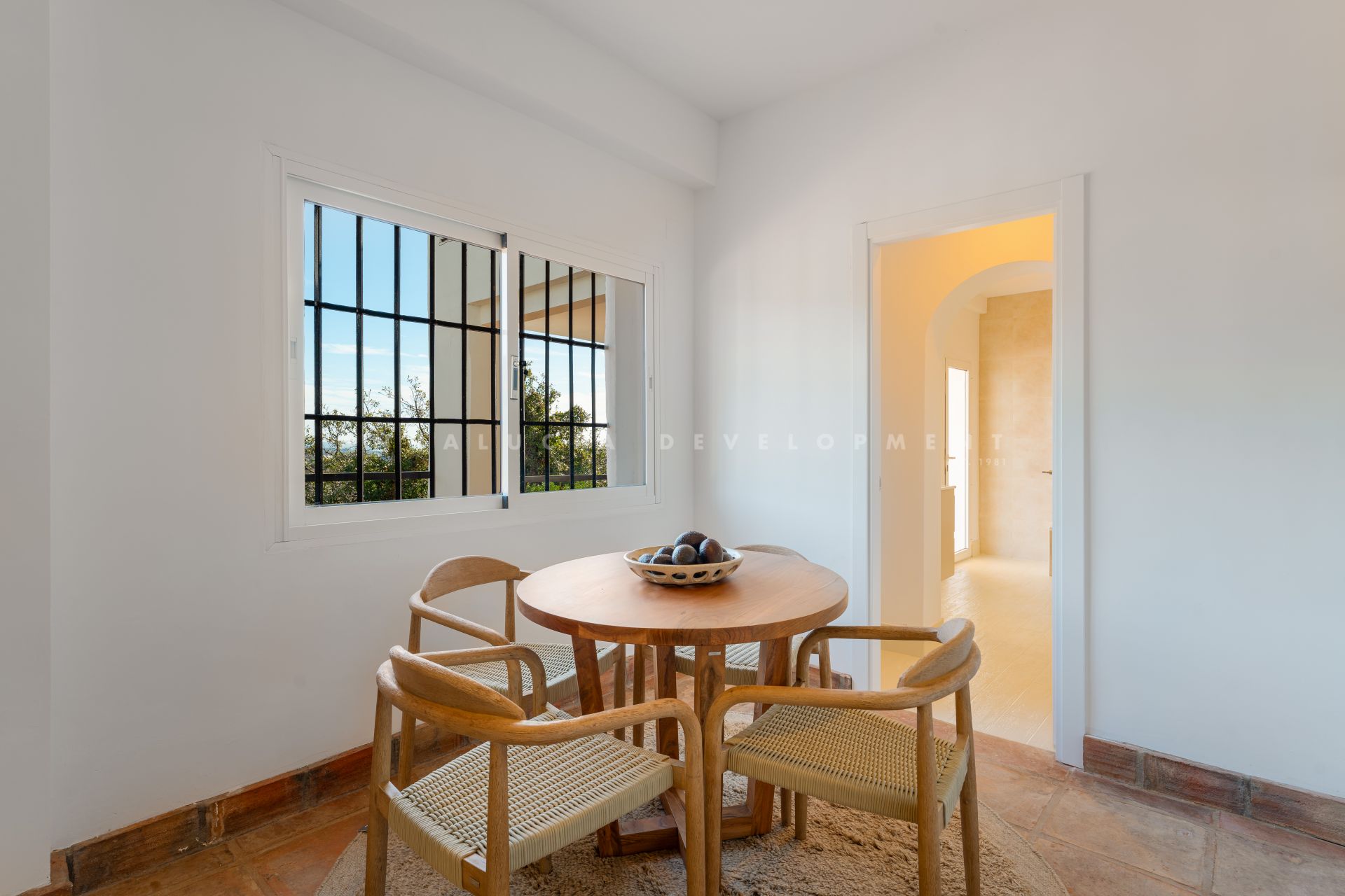 En el corazón de El Madroñal 2, esta villa se encuentra rodeada por un tranquilo paisaje de olivos y lomas cubiertas de pinos, ofreciendo una combinación única de lujo y naturaleza. Esta exclusiva urbanización cerrada se enorgullece de brindar seguridad las 24 horas y un fuerte sentido de pertenencia entre sus residentes. Vivir aquí es como formar parte de un enclave de alta gama, donde los residentes pueden disfrutar de la serena belleza de los valles verde esmeralda que se extienden hasta el horizonte. El atractivo exterior de la villa se extiende a sus espacios al aire libre meticulosamente diseñados. Las terrazas en cada nivel ofrecen una variedad de vistas panorámicas impresionantes del entorno natural, garantizando una conexión perfecta entre la vida interior y exterior. La piscina de tamaño estándar se convierte en un punto de encuentro para la relajación y el entretenimiento, ofreciendo absoluta privacidad y comodidad. Complementando el exterior, encontramos un garaje para un coche, una cochera cubierta con capacidad para dos vehículos adicionales y un amplio aparcamiento al aire libre para varios más, brindando una comodidad excepcional tanto para residentes como para invitados. Los residentes también apreciarán la tranquilidad que proporciona la seguridad las 24 horas. Como residencia, esta villa está diseñada para quienes valoran la conexión con la naturaleza sin renunciar al lujo moderno. Los interiores de la villa, amueblados con un elegante estilo bohemio, ofrecen una solución integral para entrar a vivir, eliminando el estrés típico de una mudanza. Cada detalle ha sido cuidadosamente seleccionado para ofrecer una experiencia de vida impecable, desde las vistas panorámicas al mar visibles desde diversos puntos de la villa hasta los espacios serenos perfectos para la reflexión y la relajación. La combinación de todos estos factores convierte la vida en esta villa en El Madroñal en una experiencia privilegiada y excepcional. Es más que un simple lugar para vivir; es un estilo de vida marcado por la tranquilidad, la exclusividad y el lujo. Este entorno invita a los residentes a disfrutar de los pequeños placeres de la vida, rodeados de una exuberante belleza natural. Aquí, en este ambiente sereno y a la vez sofisticado, le espera una nueva vida.