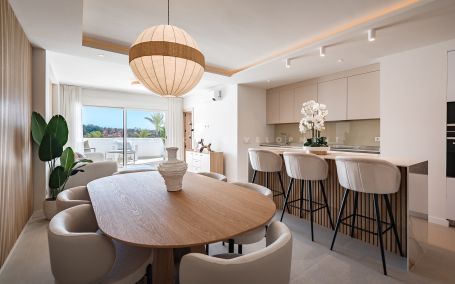 Este moderno apartamento de dos dormitorios en planta media, ubicado en La Maestranza, Nueva Andalucía, ofrece un estilo de vida elegante con reformas de alta calidad y una meticulosa atención al detalle. El amplio salón-comedor da a una terraza con preciosas vistas a los jardines comunitarios, mientras que la cocina totalmente equipada cuenta con electrodomésticos de alta gama. El dormitorio principal con baño en suite y el dormitorio de invitados disfrutan de vistas panorámicas a la montaña de La Concha. Además, incluye aire acondicionado frío-calor y una plaza de aparcamiento subterráneo. Ubicado en la urbanización cerrada y segura de La Maestranza, con seguridad 24 horas, está a pocos minutos de servicios y a un corto trayecto en coche de la playa.