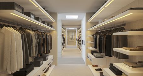 Baje a la planta baja, donde le esperan tres dormitorios con baño privado, cada uno con su propia terraza privada. La suite principal es un auténtico santuario, con vestidores para él y para ella, un armario especial para zapatos y bolsos, y un lujoso baño privado. Para el ocio y el bienestar, esta planta también cuenta con una sala de juegos, una sala de TV y un gimnasio privado con sauna y ducha independientes, perfecto tanto para relajarse como para ponerse en forma. Desde aquí, puede acceder al hermoso jardín paisajístico en la base de la propiedad, que ofrece un remanso de paz.
