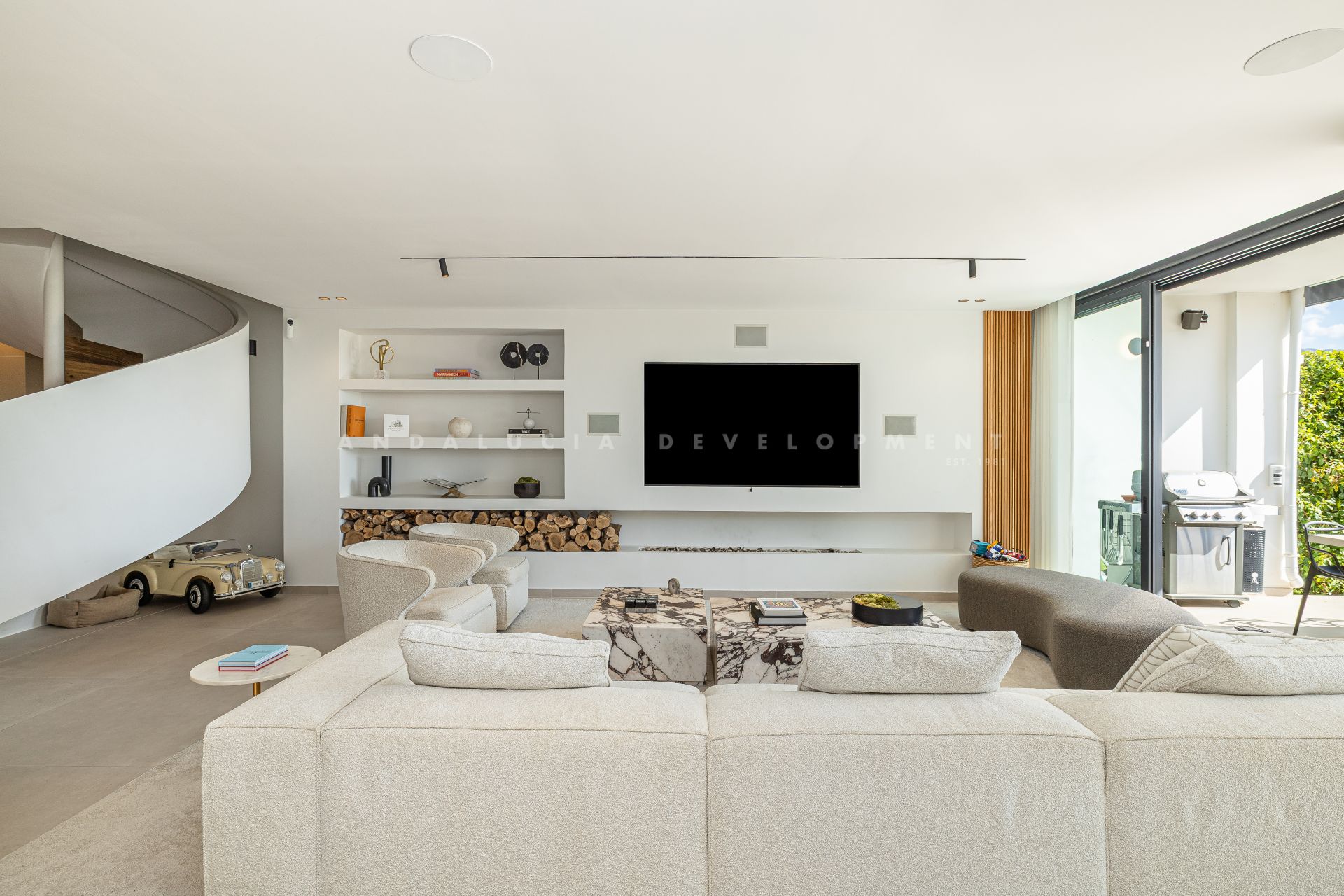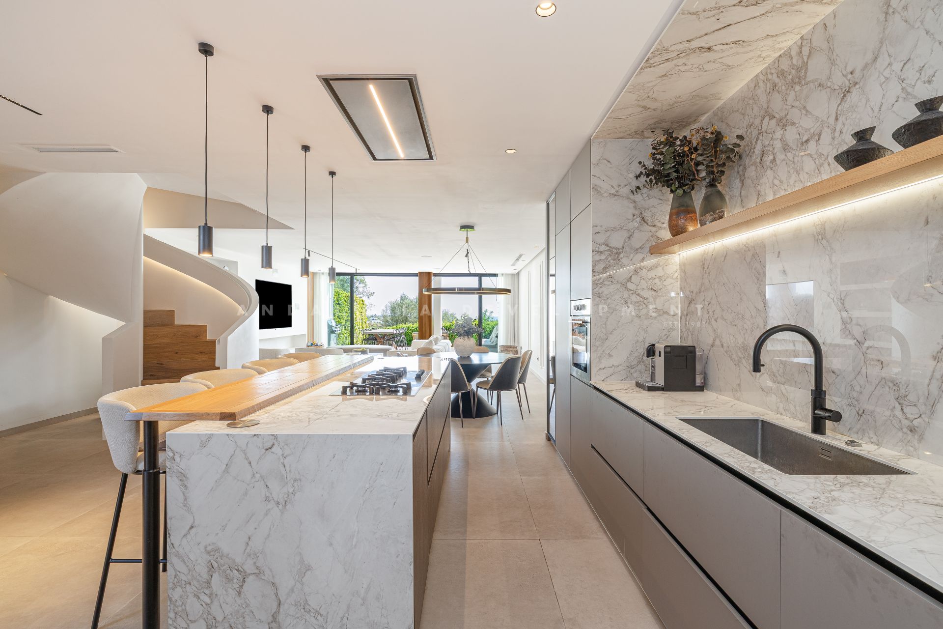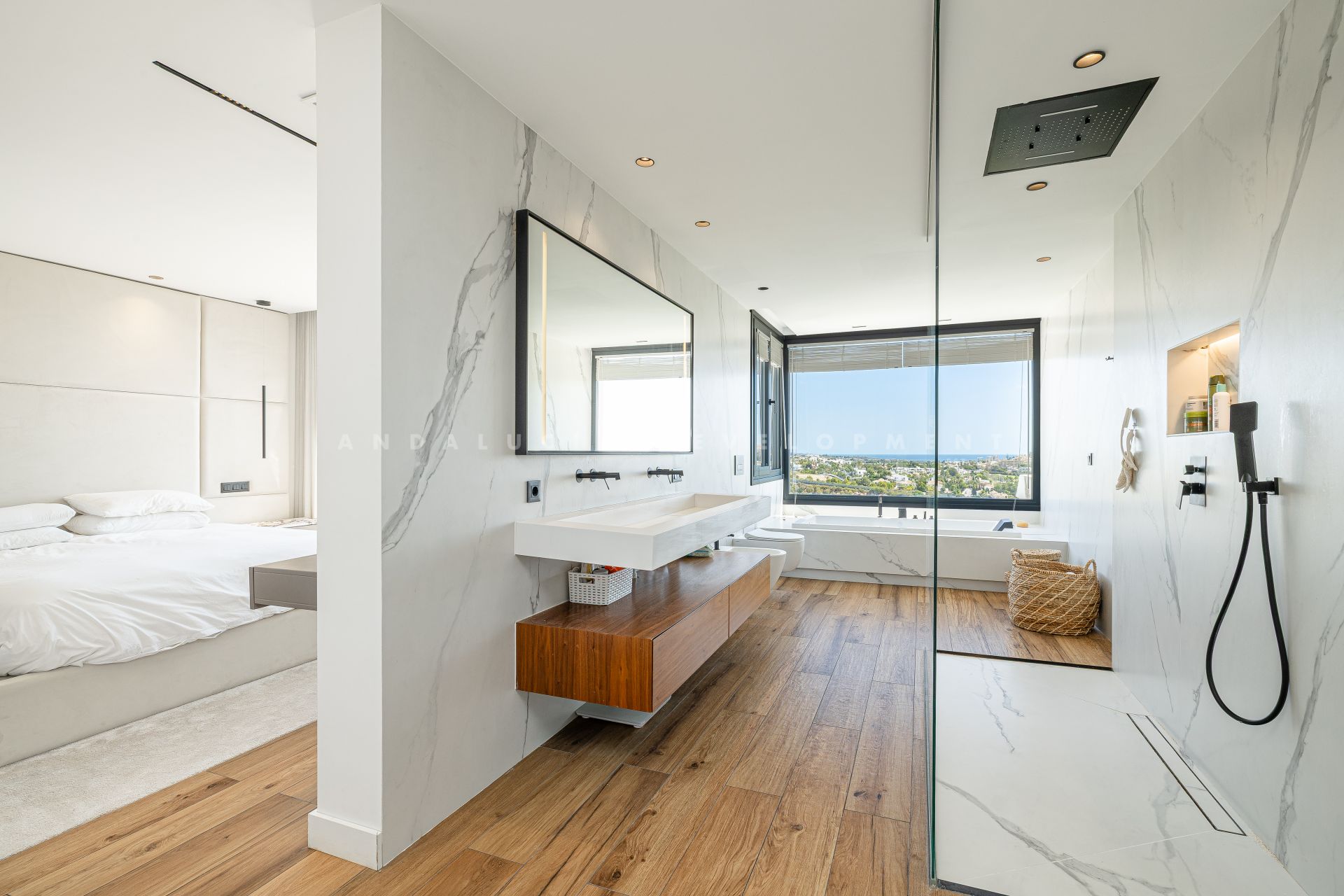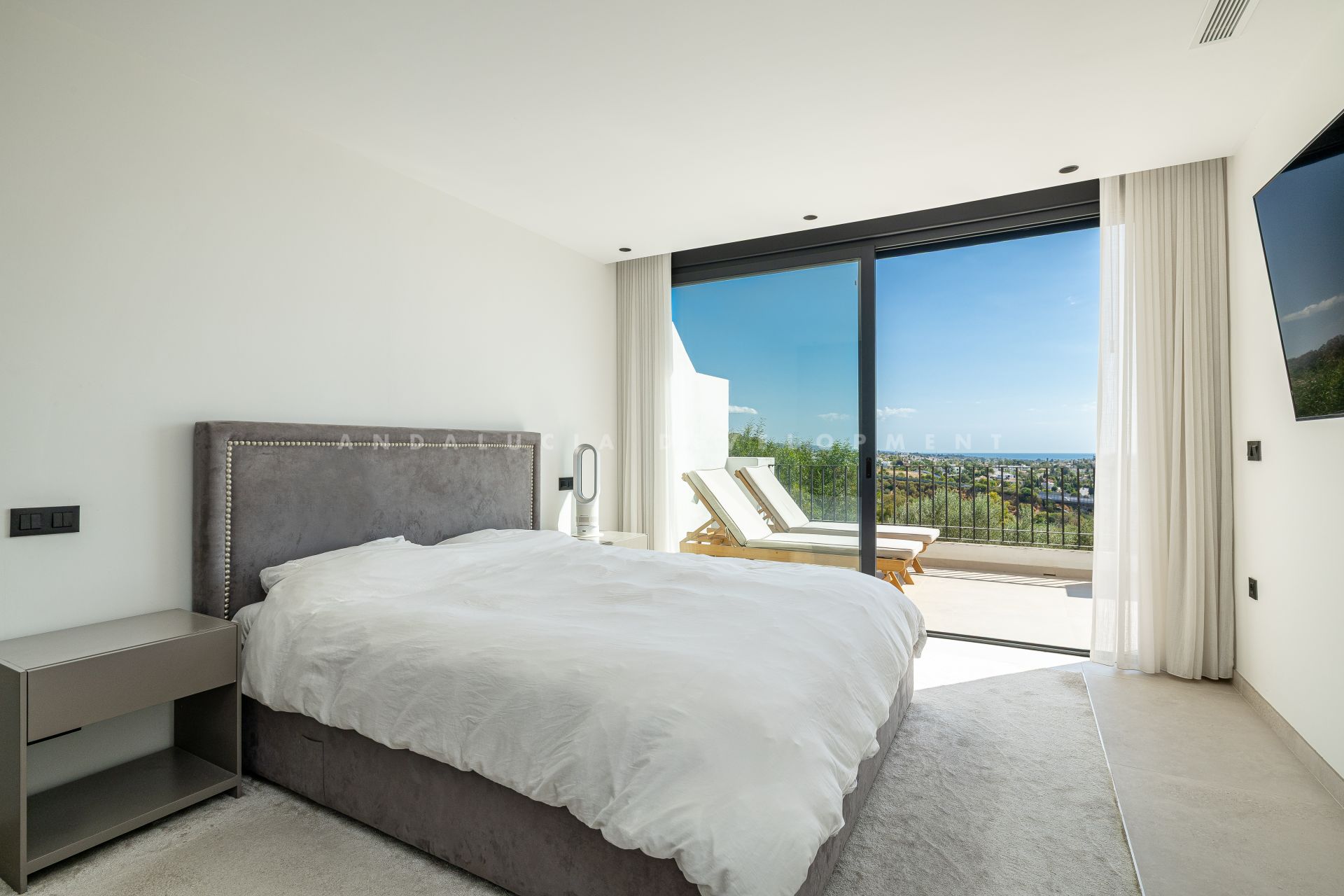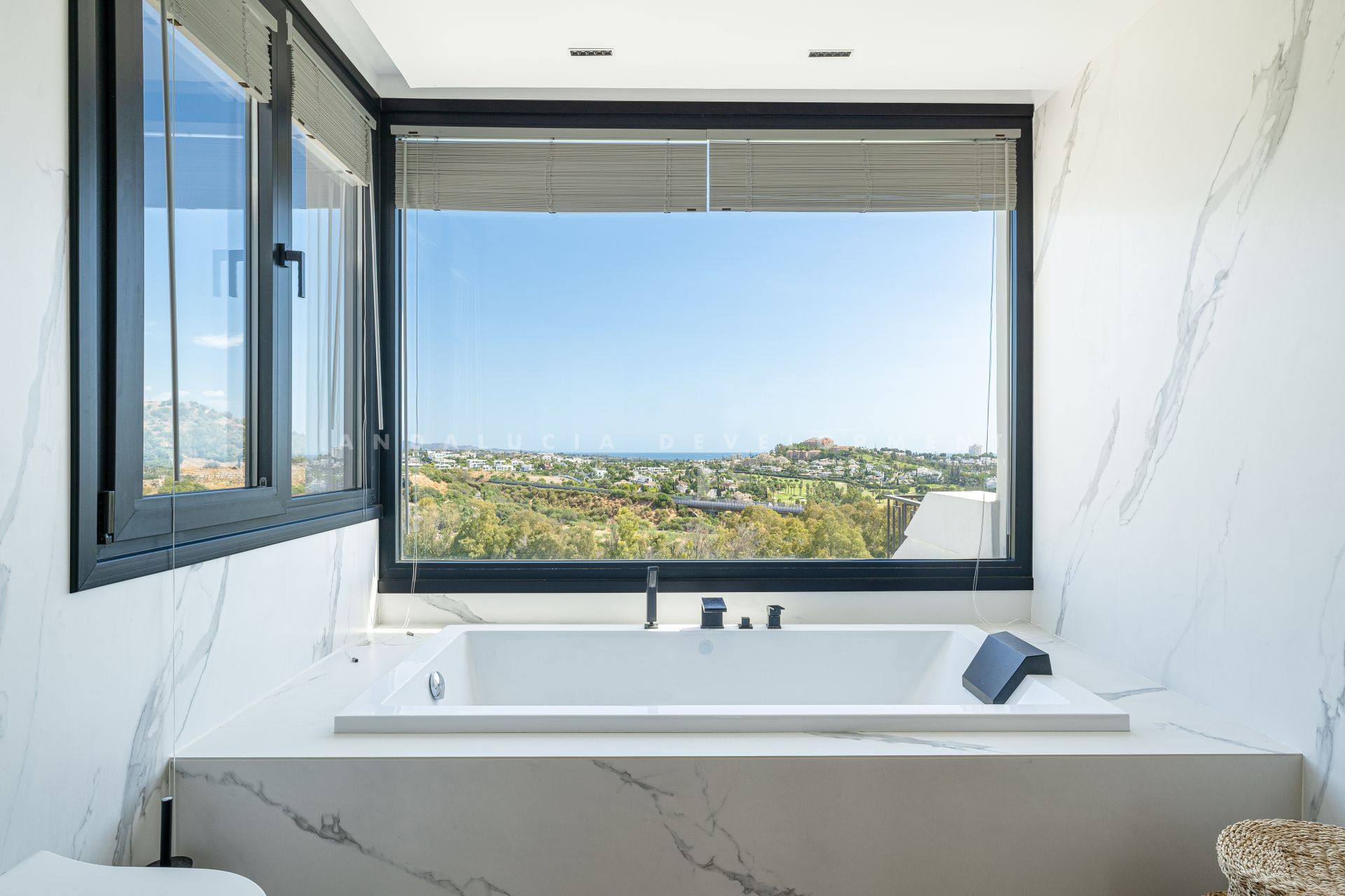 Elegante casa adosada con impresionantes vistas en La Quinta Golf. Ubicada en la prestigiosa comunidad de La Quinta Golf, esta casa adosada, bellamente renovada, ofrece impresionantes vistas al mar, al campo de golf y a la montaña desde todos los niveles. Diseñada para el lujo moderno, la casa cuenta con una luminosa sala de estar de planta abierta, una elegante cocina Barazza con isla central y una elegante chimenea de bioetanol. Amplias puertas correderas de suelo a techo dan a una espaciosa terraza, ideal para comer al aire libre y relajarse. La primera planta alberga tres elegantes dormitorios con baño en suite, dos de ellos con terraza privada. La suite principal, en la planta superior, ofrece un refugio privado con un lujoso baño en suite que incluye ducha de efecto lluvia y bañera exenta con vistas panorámicas. Equipada con un sistema de domótica, calefacción por suelo radiante, aire acondicionado integrado, sistema de sonido envolvente Sonos y wifi por cable, la residencia combina comodidad y funcionalidad de vanguardia. Otras características destacadas incluyen un sistema antical, un grifo de agua hirviendo instantáneo, dos plazas de aparcamiento privadas y un avanzado sistema de seguridad. Con su elegancia contemporánea y ubicación privilegiada en una de las zonas más solicitadas de Marbella, esta casa adosada es perfecta como residencia permanente, una escapada de vacaciones o una distinguida oportunidad de inversión.