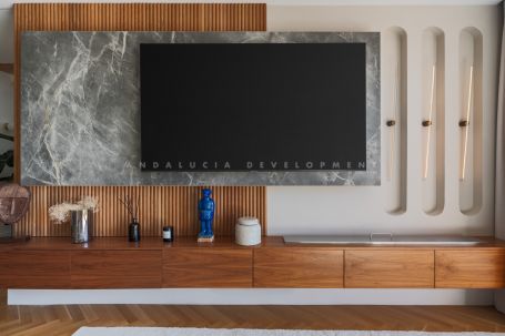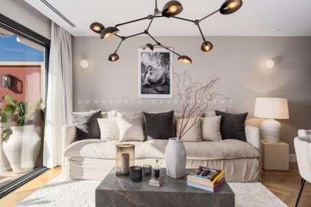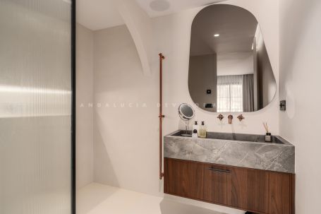 Esta casa incluye tres espaciosas habitaciones, cada una con baño en suite, y un elegante aseo de invitados que realza la funcionalidad de la propiedad. El diseño interior enfatiza la luz natural, la amplitud y la calidez, gracias a la orientación sureste y a las ventanas y puertas de terraza Cortizo Slim de suelo a techo, especialmente en el salón, donde se deslizan completamente hacia un lado para crear una amplia conexión con el exterior. En todo el apartamento, los elegantes suelos de madera con diseño en espiga de chevron le confieren un carácter atemporal, mientras que todas las puertas se extienden de suelo a techo, realzando la sensación de altura y volumen en cada estancia. El estilo interior es refinado y a la vez confortable, con muebles de marcas de diseño de alta gama como Bycrea y Zoco Home.