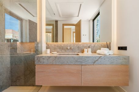 Esta villa contemporánea, ubicada en la codiciada zona residencial de Linda Vista Baja en San Pedro de Alcántara, combina una arquitectura elegante con comodidades de lujo. Tras sus impecables paredes blancas y su cuidada vegetación, la propiedad ofrece un oasis privado con una piscina cristalina rodeada de una elegante terraza de madera y una amplia terraza cubierta ideal para comer y relajarse. Los amplios espacios exteriores, que incluyen un solárium en la azotea, crean el ambiente perfecto para relajarse y disfrutar del tiempo libre. En el interior, el diseño es luminoso y moderno, realzado por suaves tonos neutros, elegante iluminación empotrada y ventanales que inundan la casa de luz natural. La sala de estar y el comedor, de planta abierta, cuentan con una llamativa pared de entretenimiento a medida y accesorios contemporáneos, que se integran a la perfección con la cocina de vanguardia. Aquí, una cálida isla de madera contrasta a la perfección con los elegantes gabinetes y electrodomésticos integrados, mientras que el espacioso comedor invita a disfrutar de agradables comidas con amigos y familiares. Las habitaciones privadas de la villa mantienen la sofisticada estética. Las habitaciones son serenas y espaciosas, con puertas de cristal que se abren a terrazas y baños en suite que irradian la elegancia de un spa con tocadores flotantes, acabados de mármol y bañeras independientes. La suite principal impresiona por sus lujosas proporciones y acceso directo a una soleada terraza, creando un íntimo refugio dentro de la casa. Para el bienestar y el ocio, la planta baja incluye un gimnasio totalmente equipado, con sauna y baño de vapor acristalados, y amplio espacio para hacer ejercicio y relajarse. Un garaje seguro y una elegante entrada añaden comodidad y privacidad a esta excepcional residencia. Diseñada para la vida costera contemporánea, esta villa en Linda Vista Baja ofrece un estilo refinado y todas las comodidades modernas en una ubicación privilegiada.