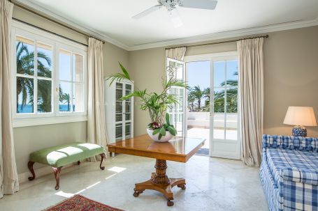 Una propiedad privilegiada frente al mar en Los Monteros, Marbella Este, ofrece una ubicación excepcional a pocos pasos del mar. Esta elegante propiedad presenta una arquitectura clásica con una fluida integración interior-exterior, maximizando el espacio y la luz natural. El imponente vestíbulo de entrada conduce a amplias salas de estar, que incluyen un impresionante comedor formal y una gran cocina con isla central y electrodomésticos modernos, ideal tanto para el día a día como para el entretenimiento. Diseñada para la comodidad y la funcionalidad, la casa incluye acceso directo a la terraza desde la planta baja, un jardín impecablemente cuidado con piscina privada y amplias terrazas para comer al aire libre y relajarse. Características adicionales como un amplio gimnasio y un espacioso garaje privado realzan el atractivo de la propiedad. Con impresionantes vistas al mar y cerca de los mejores servicios de Marbella, esta residencia es una oportunidad única en una ubicación privilegiada.
