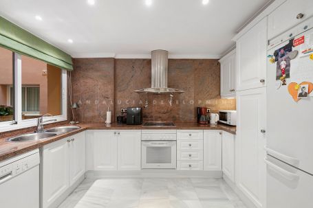 Presentamos este espacioso apartamento de esquina de dos dormitorios, ubicado en la cotizada urbanización Magna Marbella en Nueva Andalucía, con impresionantes vistas panorámicas al mar, la montaña y el campo de golf desde su terraza orientada al oeste. El alojamiento consta de recibidor, cocina totalmente equipada, amplio salón-comedor con acceso directo a la terraza cubierta/descubierta, dormitorio principal en suite con acceso directo a la terraza, un amplio dormitorio de invitados y un baño familiar. Esta unidad se puede convertir en un apartamento de tres dormitorios y una característica especial es su amplia terraza doble. La urbanización cuenta con seguridad 24 horas, dos piscinas comunitarias, una plaza de aparcamiento subterráneo y un trastero incluidos en el precio.