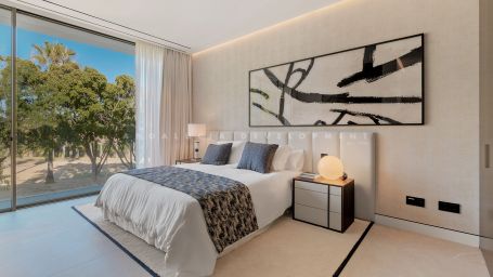 Una impresionante residencia con orientación oeste ubicada en la prestigiosa comunidad Vilas 12 en la Milla de Oro de Marbella. La villa incluye cuatro dormitorios, cada uno diseñado con privacidad y lujo en mente. La suite principal en el primer piso ofrece un amplio vestidor, un lujoso baño en suite y una terraza privada. Si bien las vistas al mar solo están disponibles desde la terraza de la azotea, realmente vale la pena subir. Dos dormitorios de invitados adicionales en este piso, con armarios hechos a medida, comparten estos estándares impecables. Un cuarto dormitorio en el sótano se beneficia de la luz natural, lo que lo convierte en un espacio acogedor para los invitados o un refugio apartado.
