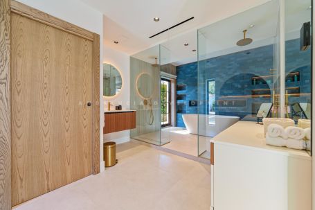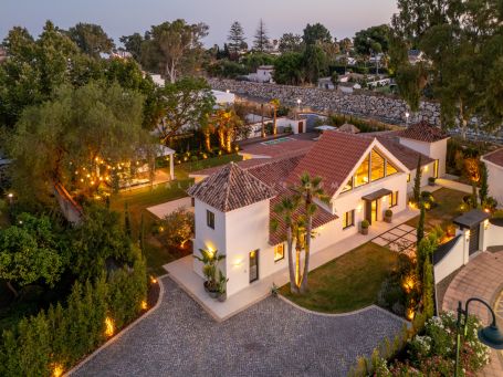 Esta excepcional villa de una sola planta, ubicada a pocos minutos del vibrante Puerto Banús, ofrece un estilo de vida contemporáneo y refinado con una fluida integración entre el interior y el exterior. Ubicada en una amplia parcela con total privacidad, la casa ofrece cinco amplios dormitorios, amplios interiores diáfanos y un impactante recibidor de doble altura con una línea de tejado geométrica que le aporta un toque arquitectónico. Líneas limpias, acabados de alta gama y amplios ventanales crean un ambiente luminoso, perfecto para la vida mediterránea moderna. El jardín, cuidadosamente diseñado, está diseñado tanto para el entretenimiento como para la relajación. En el centro se encuentra una gran piscina privada rodeada por una elegante terraza de madera y decorada con tumbonas y sombrillas. Múltiples zonas de relax, una pequeña cocina exterior cubierta con barbacoa de obra y un elegante salón con pérgola ofrecen un estilo de vida al aire libre que aprovecha al máximo el sol de Marbella durante todo el año.