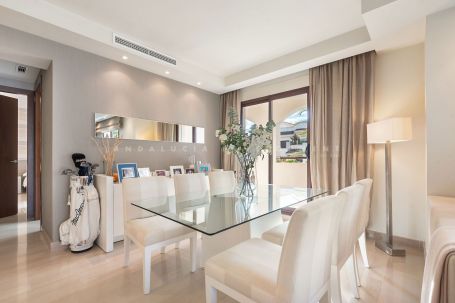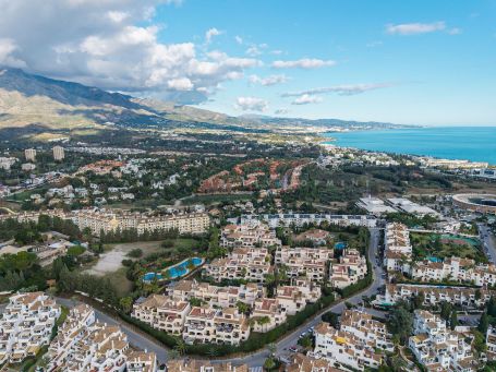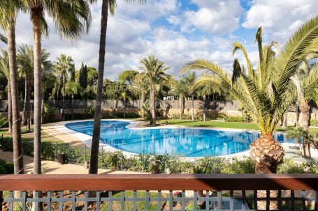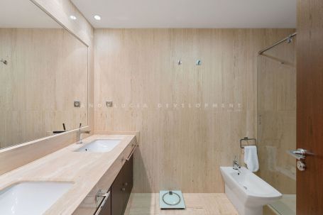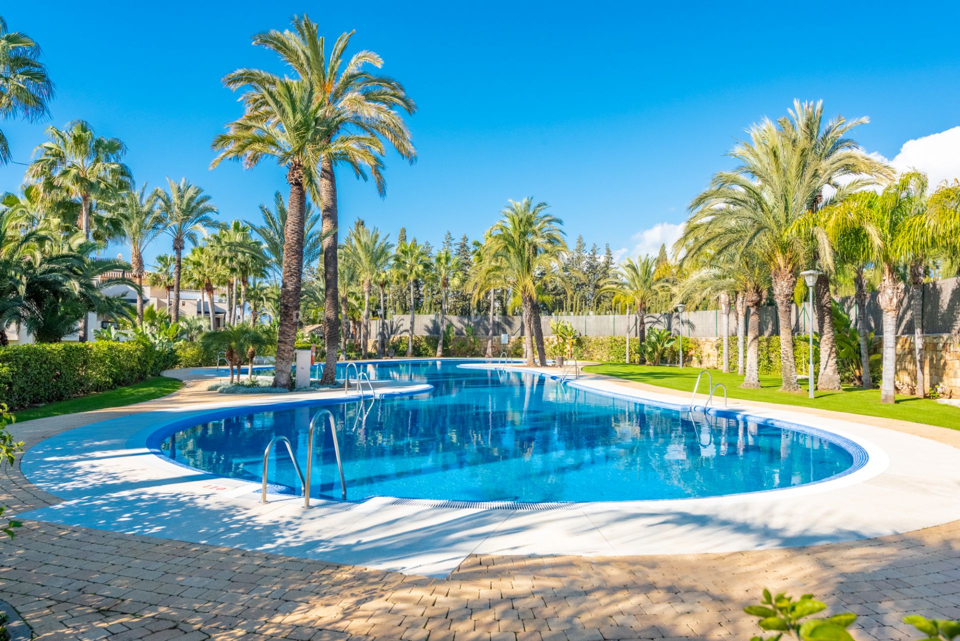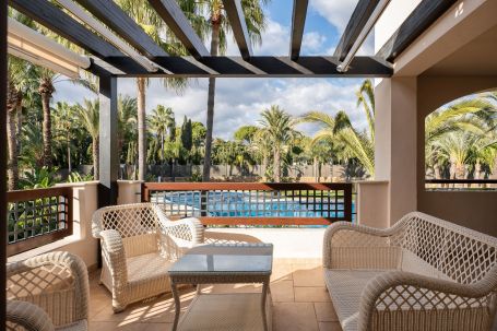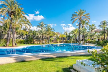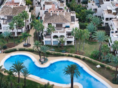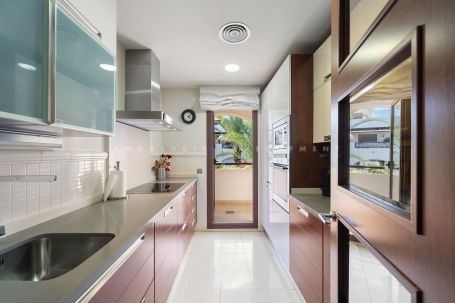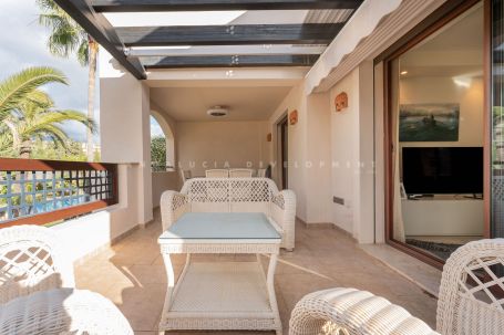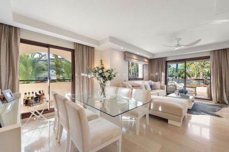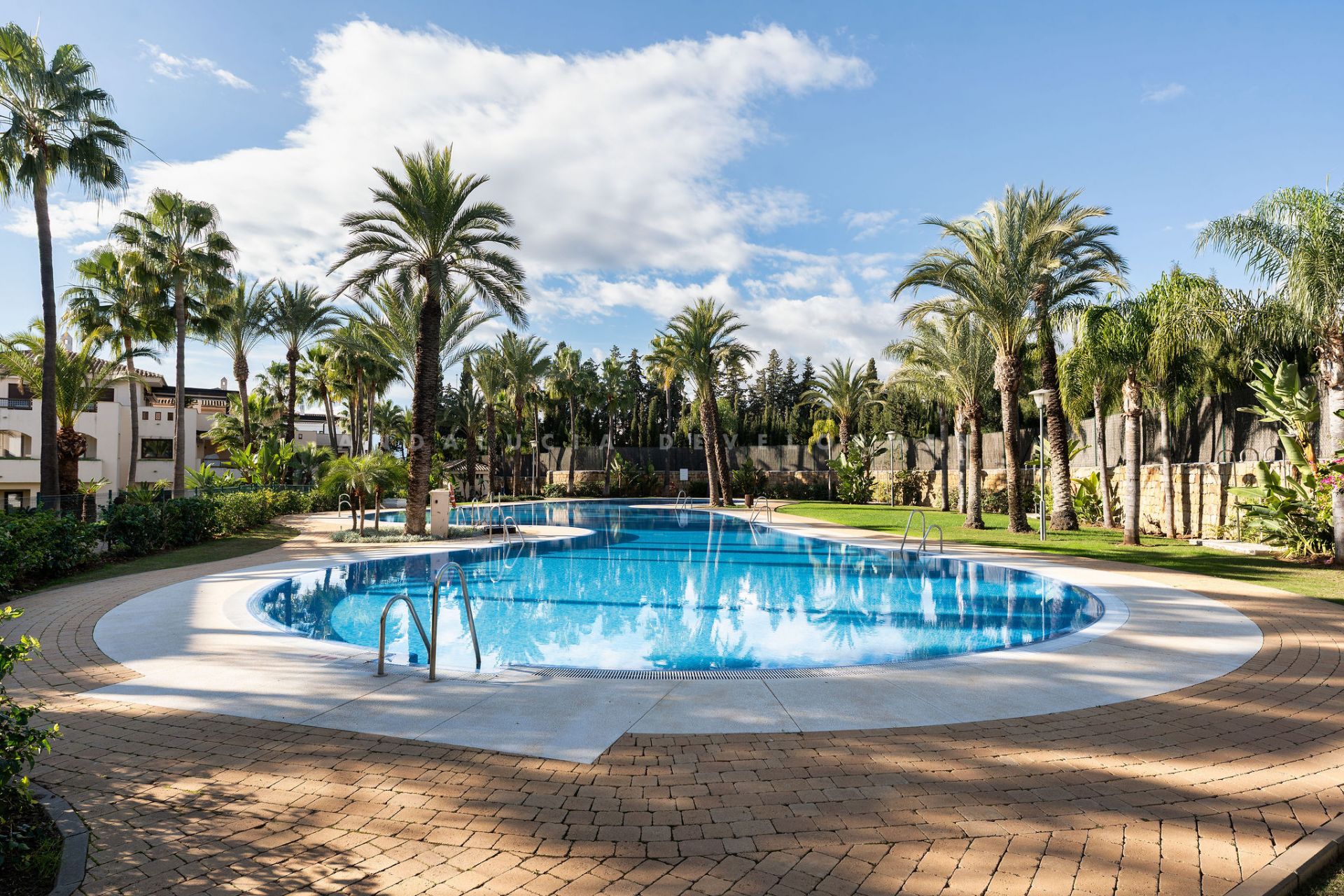 Un elegante apartamento se presenta en la exclusiva y cerrada comunidad de Medina de Banús enNueva Andalucía, Marbella. Esta propiedad destaca por su ubicación privilegiada, rodeada de comodidades, tiendas y restaurantes, y a poca distancia de las mejores playas de la Costa del Sol. El apartamento ofrece una combinación perfecta de comodidad, amplitud y privacidad, ideal tanto para residencia permanente como para escapadas de vacaciones. La propiedad cuenta con una superficie construida de 135 m2, distribuida en dos amplios dormitorios y dos baños modernos, proporcionando el espacio necesario y la comodidad para una vida relajada. El salón principal se abre a una terraza parcialmente cubierta, que ofrece agradables vistas al jardín comunitario y a la piscina. Además, la propiedad se vende con los muebles e incluye una plaza de aparcamiento privado en el garaje y un trastero.
