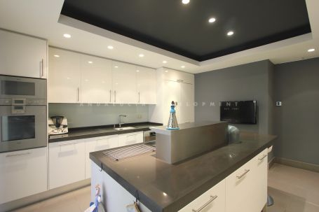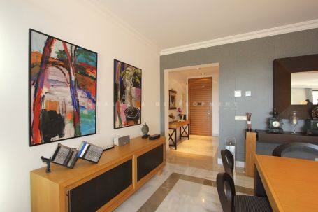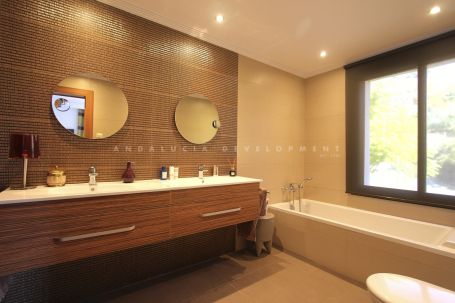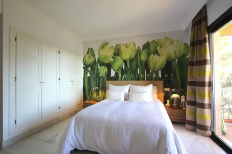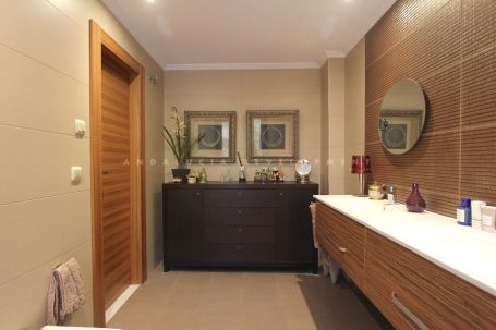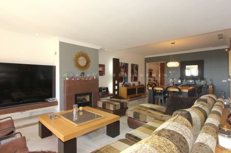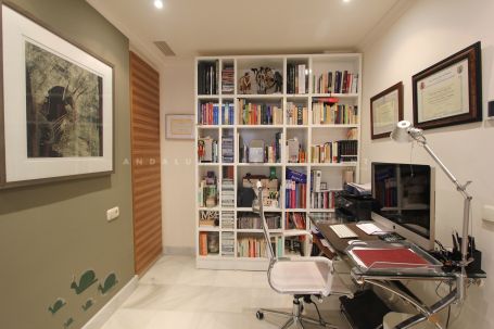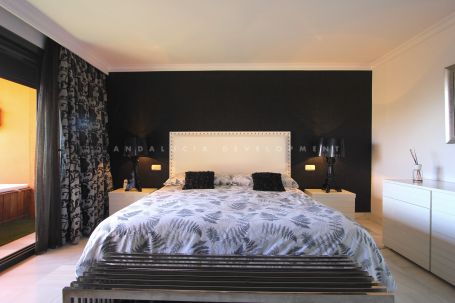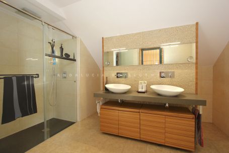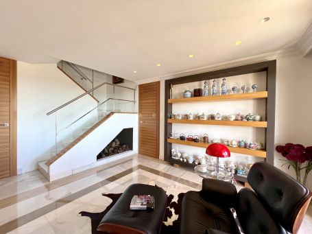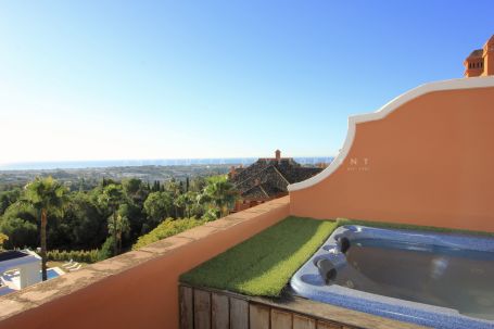 Complejo residencial con sólo 36 vecinos, muy privado y tranquilo. La urbanización Monte Halcones se encuentra en el ascenso de San Pedro de Alcántara hacia Ronda, rodeado de zonas verdes, campos de golf y desarrollos de lujo. También tiene acceso directo a La Quinta para llegar a Nueva Andalucía. En la urbanización hay un centro comercial con todo lo necesario para la vida cotidiana. El complejo tiene una piscina comunitaria, seguridad y garajes están en el nivel inferior de cada bloque. El ático dúplex se enfrenta al sureste, con vistas abiertas y panorámicas al mar y campos de golf. El ascensor le llevará desde sus 2 plazas de aparcamiento (ubicado justo en frente) hasta la entrada de la propiedad. Al entrar a través de la puerta encogimos un gran salón, a la izquierda tenemos una habitación que actualmente se ha convertido en una oficina pero podría ser un dormitorio. Después del pasillo, el amplio salón con vistas al mar, dividido en 3 áreas: el comedor, el salón con chimenea. Además, en la sala de estar hay un pequeño trastero, un baño y un leñado debajo de las escaleras. La cocina es muy amplia con muchas unidades de almacenamiento y una isla en el centro. En frente de la sala de estar, tenemos una gran terraza dividida en dos áreas, una gran parte está cubierta y el resto está abierto. Al lado de la sala de estar, tenemos un amplio dormitorio con su baño en-suite y terraza privada. En la parte superior tenemos el dormitorio principal con su baño en suite, vestidor para él y ella, y una gran terraza con impresionantes vistas al mar donde se puede disfrutar del jacuzzi. La propiedad cuenta con 2 plazas de aparcamiento (29m2) y un trastero (11m2). Aire acondicionado Daikin, calefacción por suelo radiante en baños, carpintería interior de madera exótica africana de Zebrano, chimenea, jacuzzi, ventanas de doble acristalamiento, alarma, toldos en la terraza, cocina con electrodomésticos de alto rendimiento, cocina con isla, piscina comunitaria.