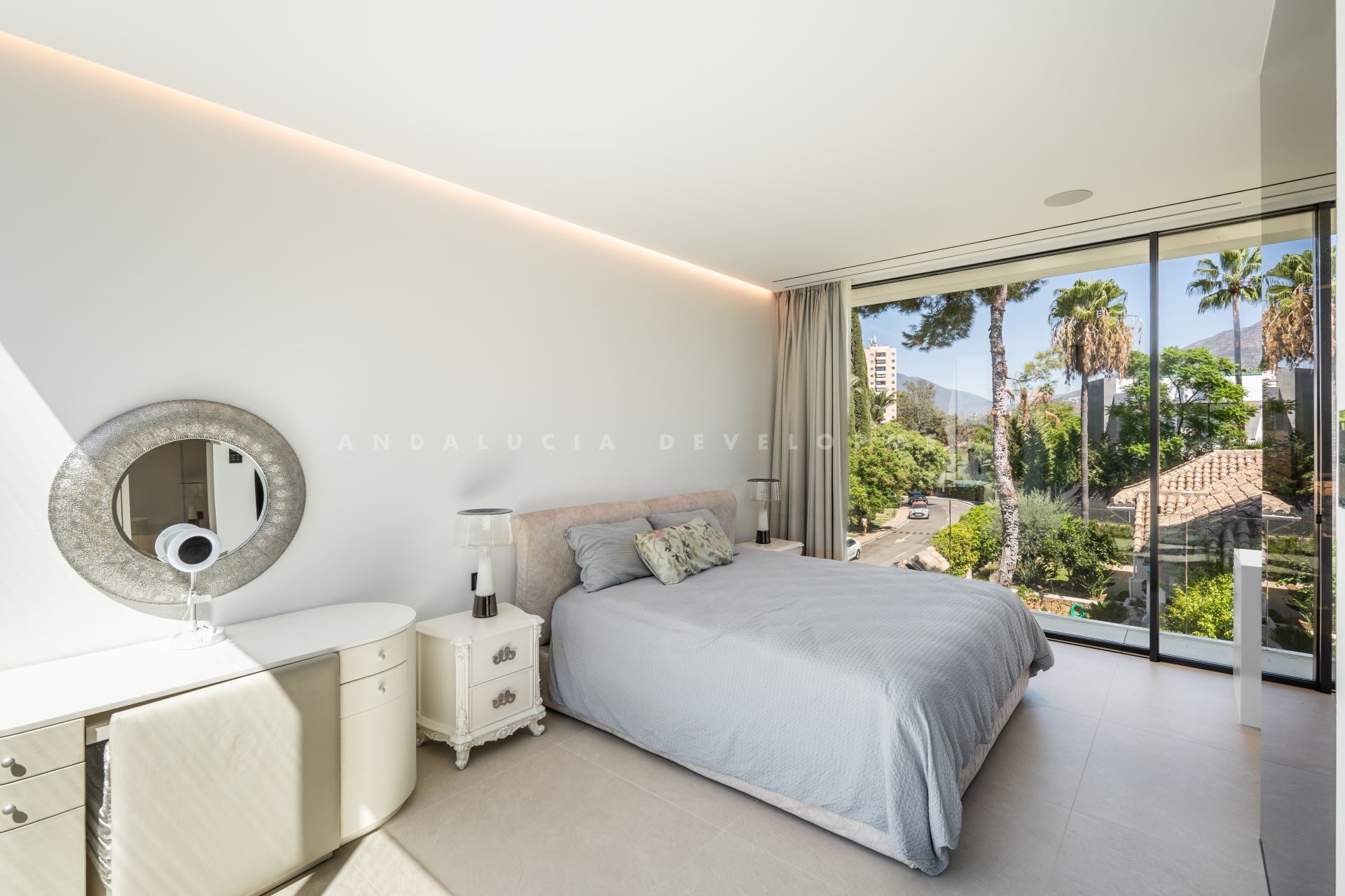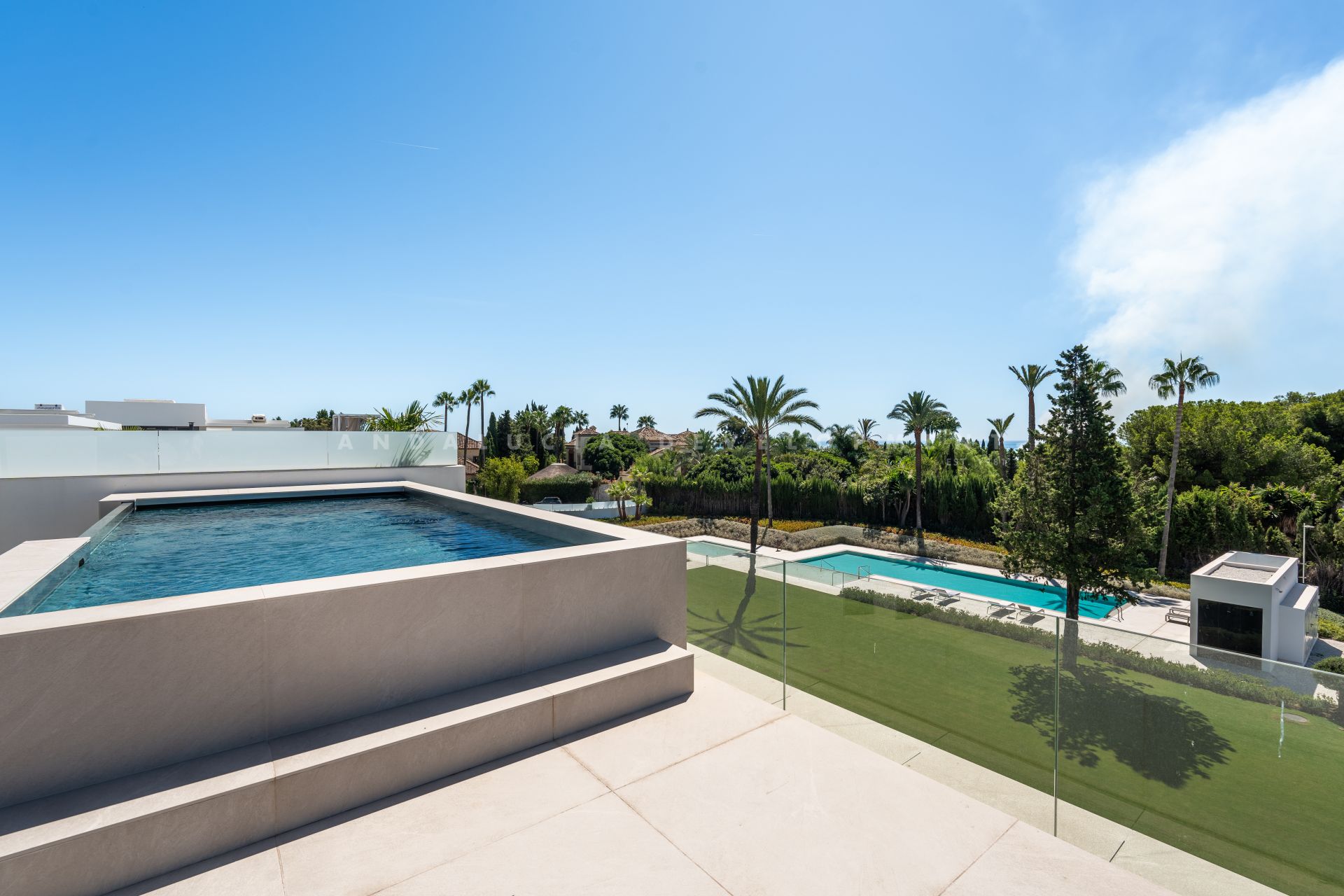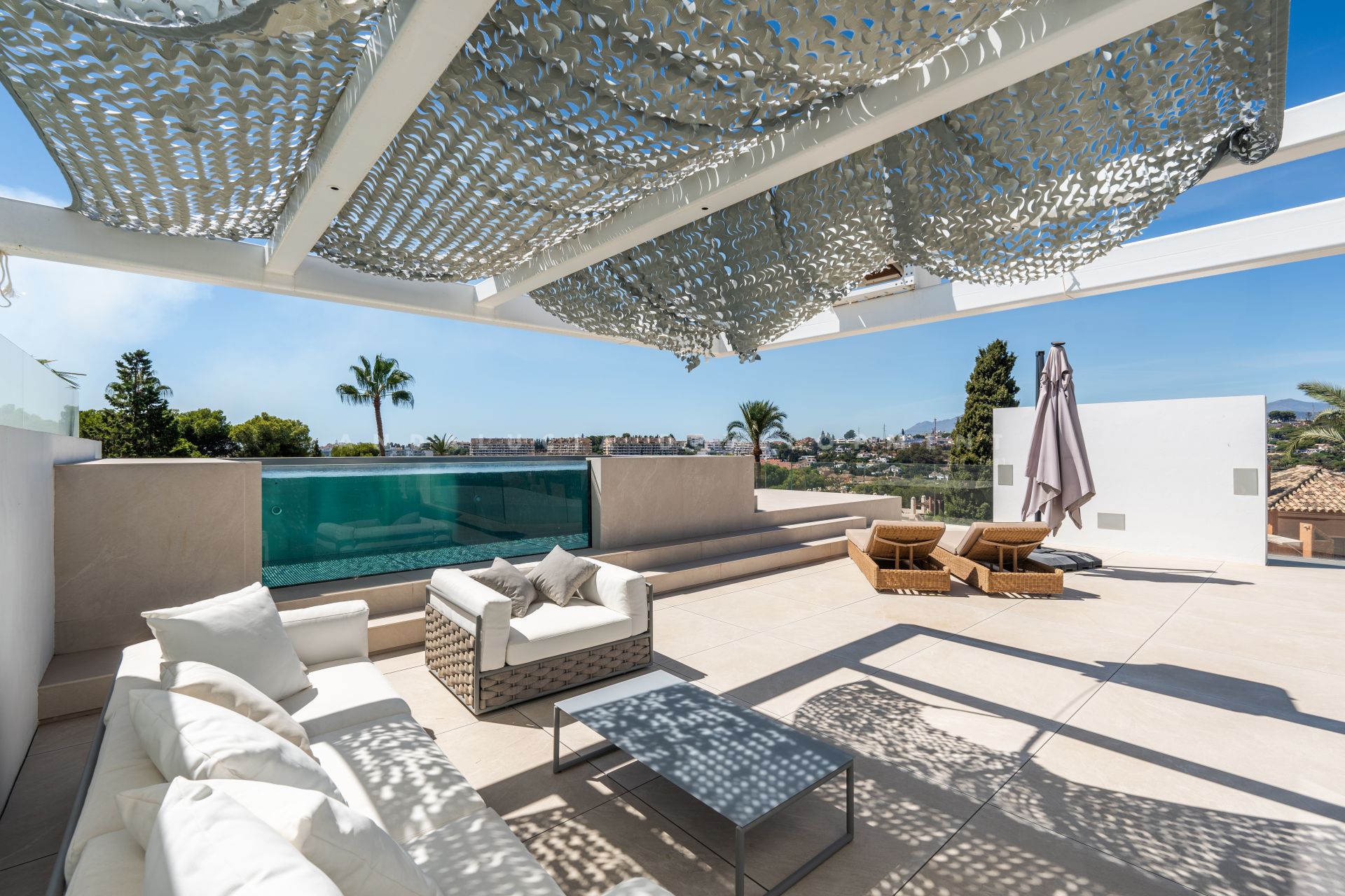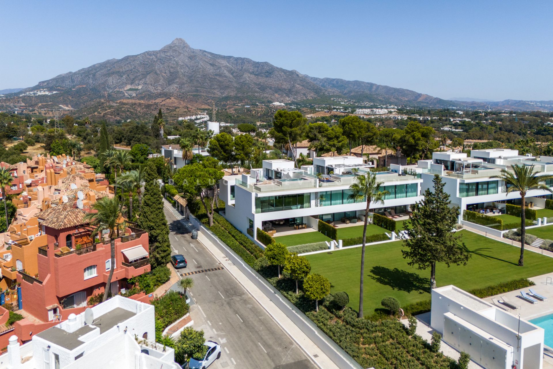 Situada en el corazón de Nueva Andalucía, esta villa adosada de nueva construcción combina arquitectura moderna, acabados de alta calidad y una ubicación privilegiada dentro de una urbanización cerrada y segura. Finalizada en diciembre de 2023, la residencia se distribuye en cuatro plantas con zonas exteriores privadas que se integran a la perfección con los interiores. Orientada al sur, la villa disfruta de vistas panorámicas al mar Mediterráneo, La Concha y Puerto Banús. Los ventanales de suelo a techo y las puertas correderas de cristal aportan abundante luz natural a cada estancia, potenciando la conexión entre el interior y el exterior. La planta principal cuenta con un salón-comedor de planta abierta que se extiende hasta una amplia terraza. Una cocina de diseño, equipada con electrodomésticos Gaggenau y con detalles minimalistas, crea un espacio culinario funcional y refinado. La vivienda incluye cuatro dormitorios y cinco baños, tres de ellos en suite. La suite principal se encuentra en la planta superior, con terrazas privadas con vistas abiertas. Los dormitorios adicionales ofrecen un uso flexible para la familia, invitados o personal. Los baños están acabados con mármol Porcelanosa y grifería de alta calidad, mientras que los suelos de madera de roble y los interiores neutros aportan calidez y sofisticación. La terraza de la azotea está diseñada para el ocio y el entretenimiento, con una piscina de inmersión y un cine al aire libre totalmente equipado. En la planta baja, la propiedad incluye un espacio versátil ideal para gimnasio, oficina o alojamiento para invitados. Tres plazas de aparcamiento subterráneo con acceso directo a la vivienda garantizan comodidad y seguridad. La urbanización cerrada cuenta con jardines paisajísticos y una gran piscina compartida, creando un entorno tranquilo a la vez que se mantiene cerca de colegios internacionales, campos de golf, playas y los servicios de Puerto Banús y Marbella.