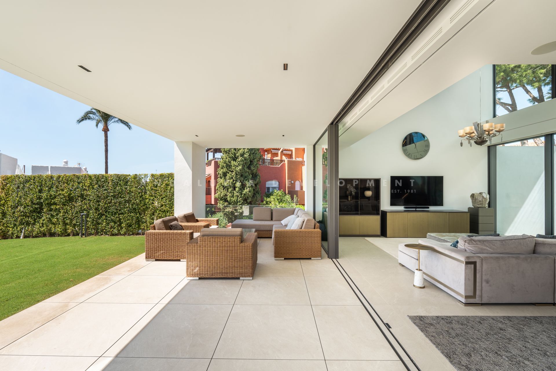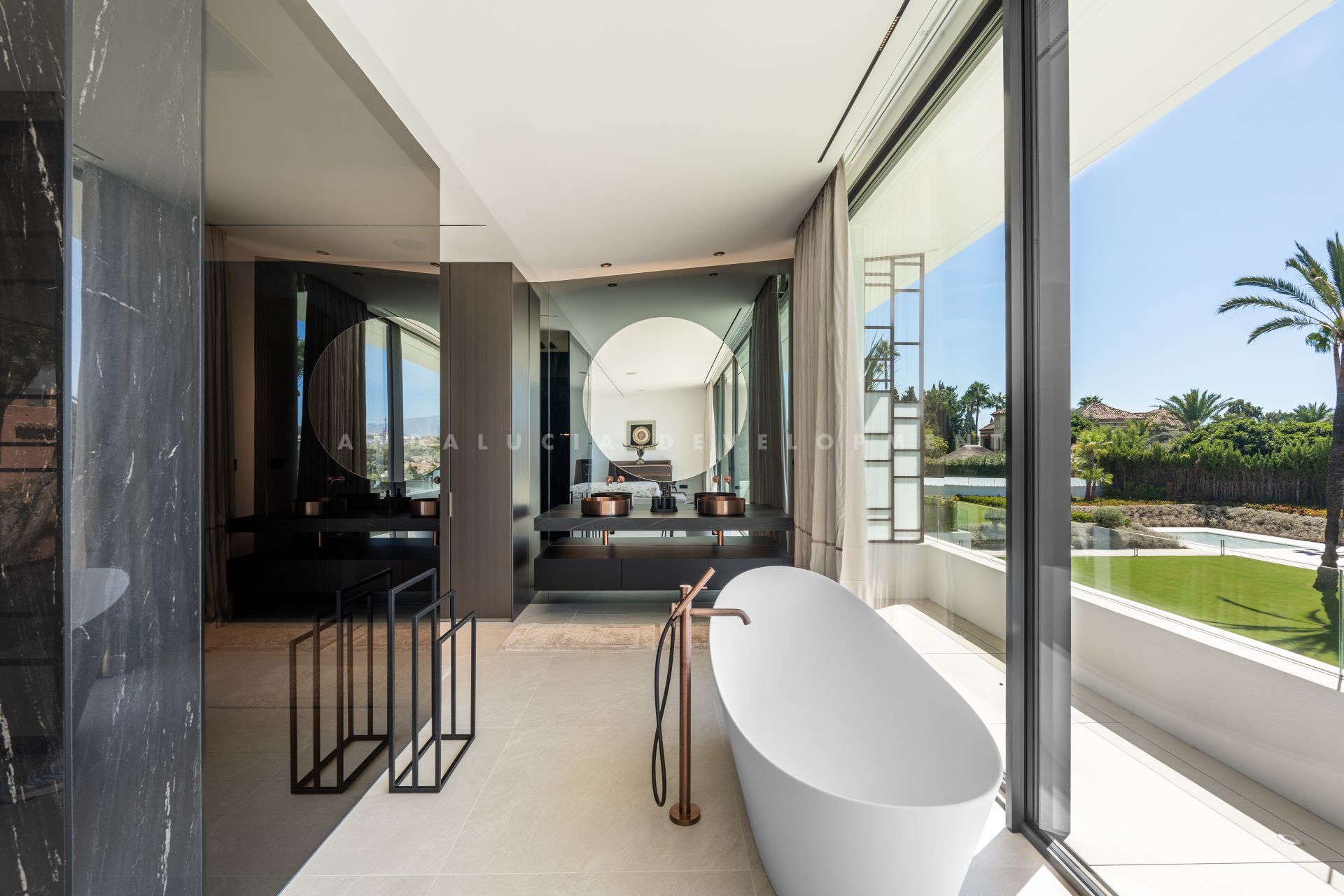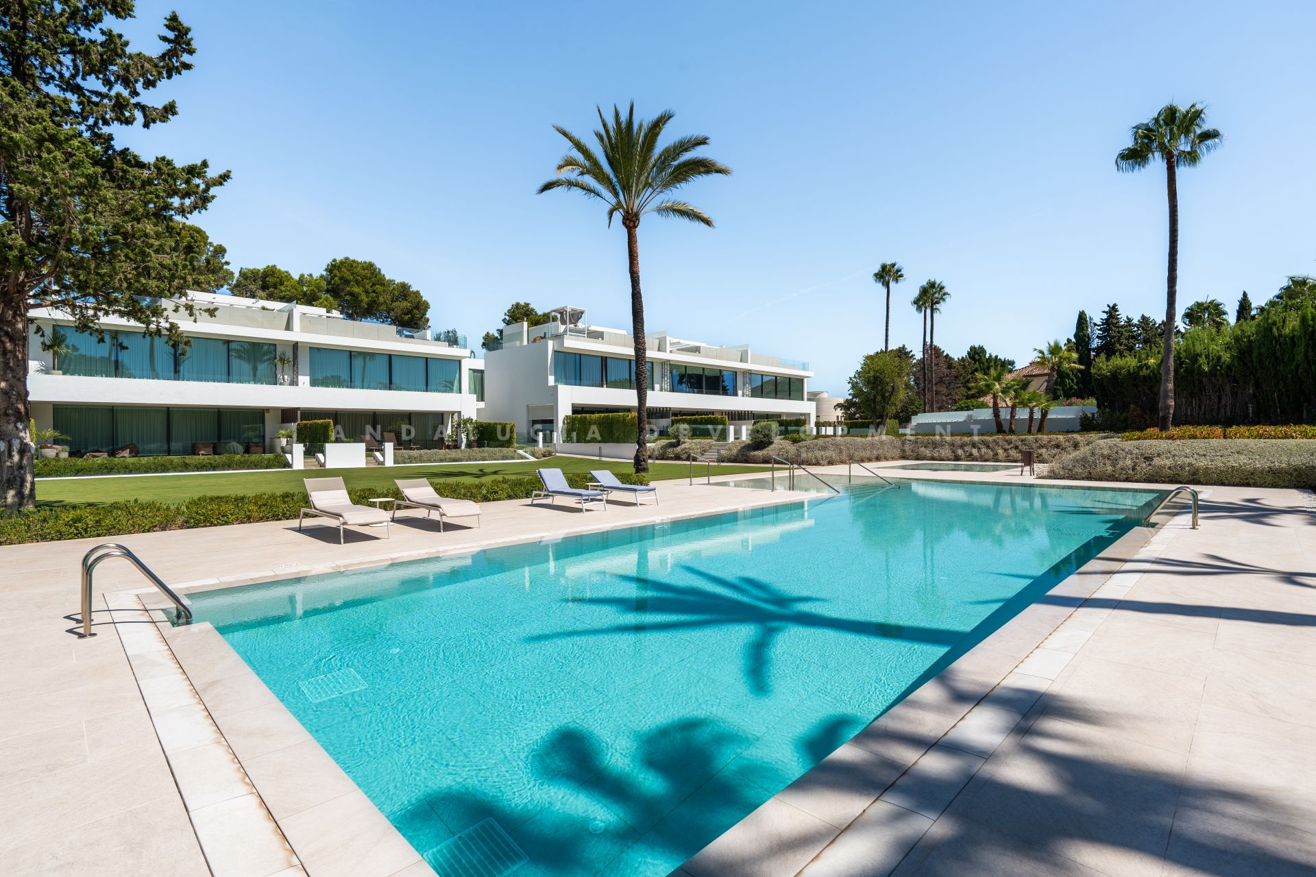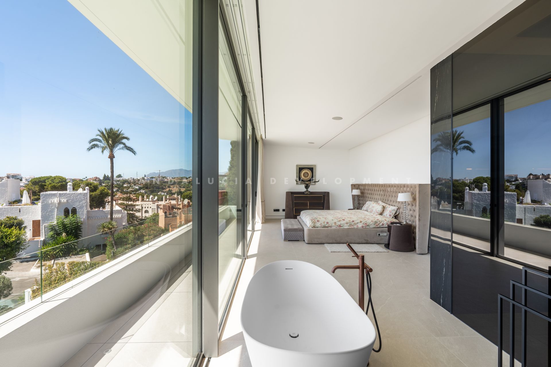 Situada en el corazón de Nueva Andalucía, esta villa adosada de nueva construcción combina arquitectura moderna, acabados de alta calidad y una ubicación privilegiada dentro de una urbanización cerrada y segura. Finalizada en diciembre de 2023, la residencia se distribuye en cuatro plantas con zonas exteriores privadas que se integran a la perfección con los interiores. Orientada al sur, la villa disfruta de vistas panorámicas al mar Mediterráneo, La Concha y Puerto Banús. Los ventanales de suelo a techo y las puertas correderas de cristal aportan abundante luz natural a cada estancia, potenciando la conexión entre el interior y el exterior. La planta principal cuenta con un salón-comedor de planta abierta que se extiende hasta una amplia terraza. Una cocina de diseño, equipada con electrodomésticos Gaggenau y con detalles minimalistas, crea un espacio culinario funcional y refinado. La vivienda incluye cuatro dormitorios y cinco baños, tres de ellos en suite. La suite principal se encuentra en la planta superior, con terrazas privadas con vistas abiertas. Los dormitorios adicionales ofrecen un uso flexible para la familia, invitados o personal. Los baños están acabados con mármol Porcelanosa y grifería de alta calidad, mientras que los suelos de madera de roble y los interiores neutros aportan calidez y sofisticación. La terraza de la azotea está diseñada para el ocio y el entretenimiento, con una piscina de inmersión y un cine al aire libre totalmente equipado. En la planta baja, la propiedad incluye un espacio versátil ideal para gimnasio, oficina o alojamiento para invitados. Tres plazas de aparcamiento subterráneo con acceso directo a la vivienda garantizan comodidad y seguridad. La urbanización cerrada cuenta con jardines paisajísticos y una gran piscina compartida, creando un entorno tranquilo a la vez que se mantiene cerca de colegios internacionales, campos de golf, playas y los servicios de Puerto Banús y Marbella.