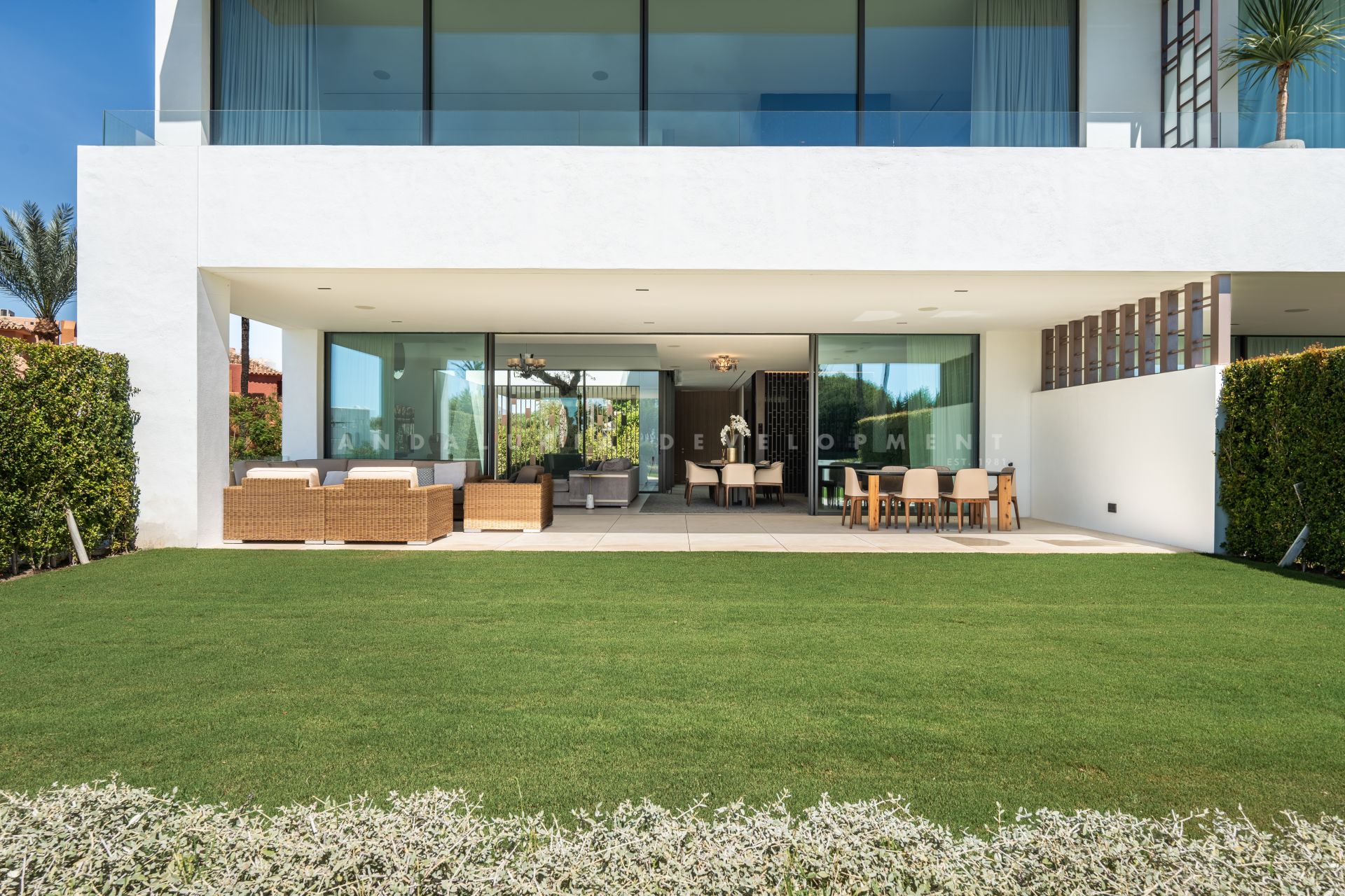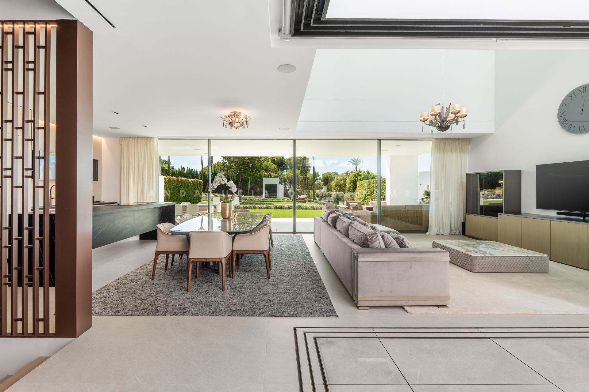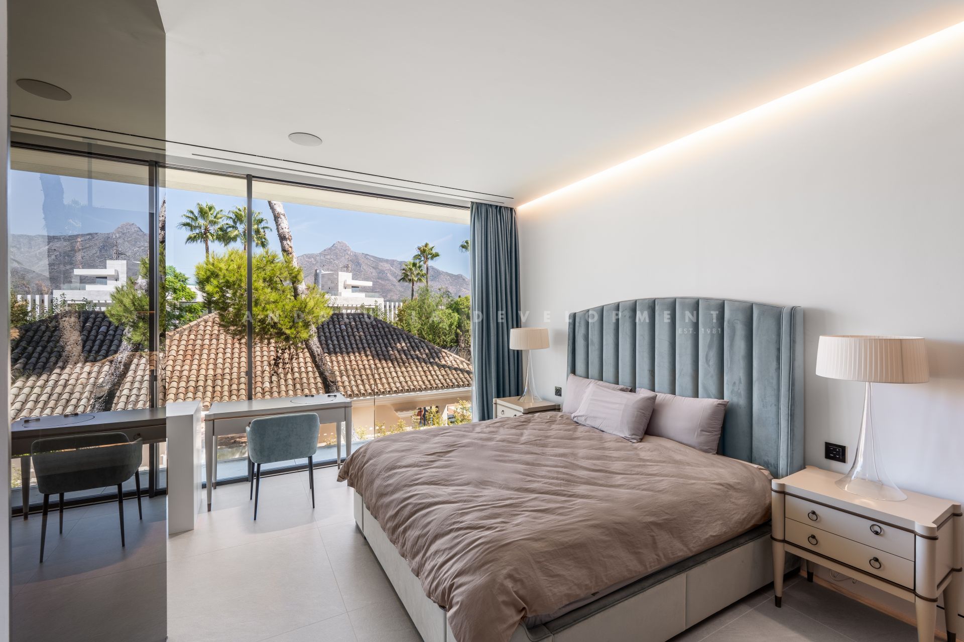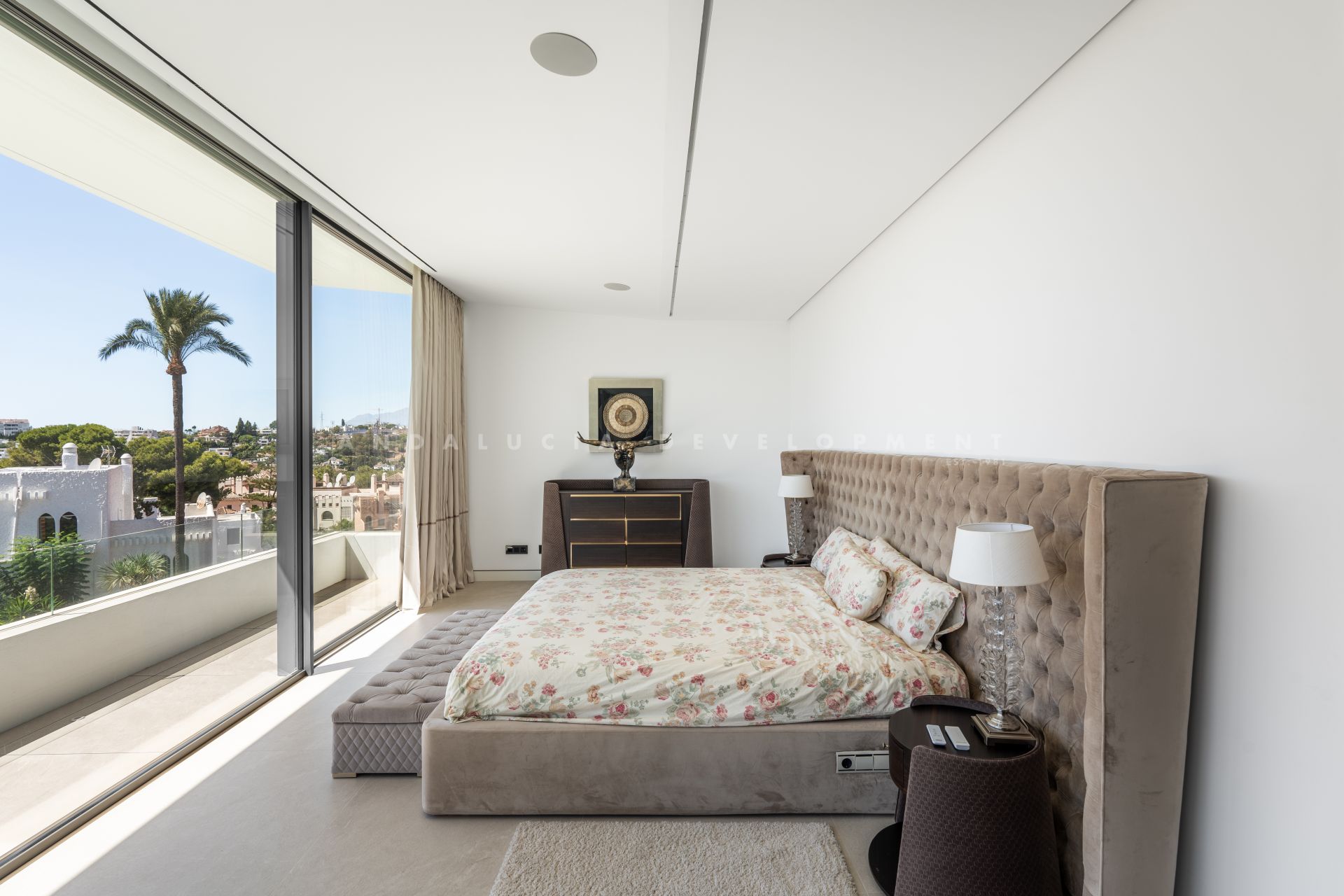 Situada en el corazón de Nueva Andalucía, esta villa adosada de nueva construcción combina arquitectura moderna, acabados de alta calidad y una ubicación privilegiada dentro de una urbanización cerrada y segura. Finalizada en diciembre de 2023, la residencia se distribuye en cuatro plantas con zonas exteriores privadas que se integran a la perfección con los interiores. Orientada al sur, la villa disfruta de vistas panorámicas al mar Mediterráneo, La Concha y Puerto Banús. Los ventanales de suelo a techo y las puertas correderas de cristal aportan abundante luz natural a cada estancia, potenciando la conexión entre el interior y el exterior. La planta principal cuenta con un salón-comedor de planta abierta que se extiende hasta una amplia terraza. Una cocina de diseño, equipada con electrodomésticos Gaggenau y con detalles minimalistas, crea un espacio culinario funcional y refinado. La vivienda incluye cuatro dormitorios y cinco baños, tres de ellos en suite. La suite principal se encuentra en la planta superior, con terrazas privadas con vistas abiertas. Los dormitorios adicionales ofrecen un uso flexible para la familia, invitados o personal. Los baños están acabados con mármol Porcelanosa y grifería de alta calidad, mientras que los suelos de madera de roble y los interiores neutros aportan calidez y sofisticación. La terraza de la azotea está diseñada para el ocio y el entretenimiento, con una piscina de inmersión y un cine al aire libre totalmente equipado. En la planta baja, la propiedad incluye un espacio versátil ideal para gimnasio, oficina o alojamiento para invitados. Tres plazas de aparcamiento subterráneo con acceso directo a la vivienda garantizan comodidad y seguridad. La urbanización cerrada cuenta con jardines paisajísticos y una gran piscina compartida, creando un entorno tranquilo a la vez que se mantiene cerca de colegios internacionales, campos de golf, playas y los servicios de Puerto Banús y Marbella.