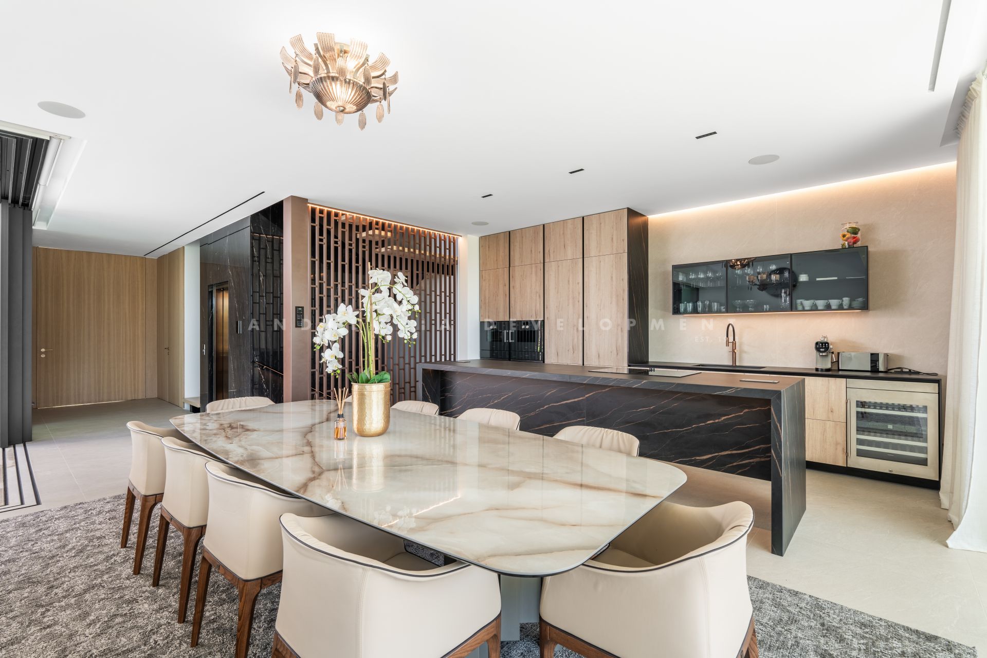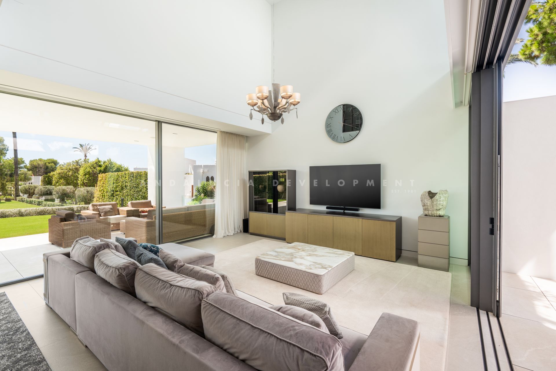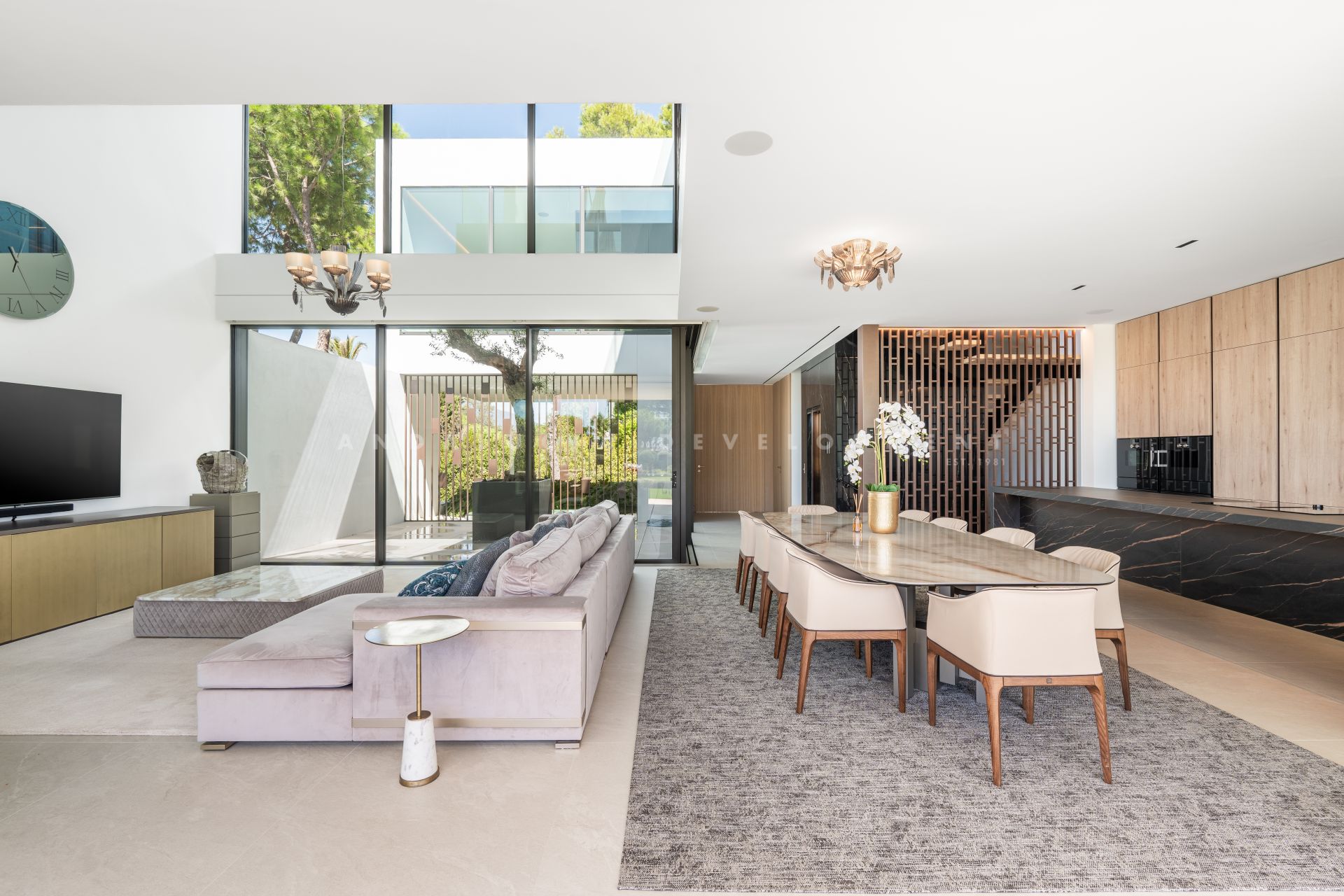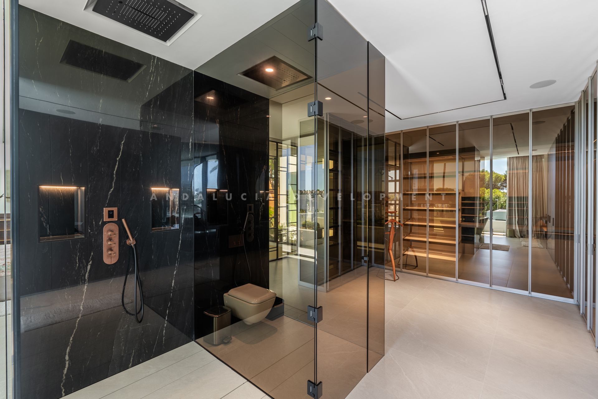 Situada en el corazón de Nueva Andalucía, esta villa adosada de nueva construcción combina arquitectura moderna, acabados de alta calidad y una ubicación privilegiada dentro de una urbanización cerrada y segura. Finalizada en diciembre de 2023, la residencia se distribuye en cuatro plantas con zonas exteriores privadas que se integran a la perfección con los interiores. Orientada al sur, la villa disfruta de vistas panorámicas al mar Mediterráneo, La Concha y Puerto Banús. Los ventanales de suelo a techo y las puertas correderas de cristal aportan abundante luz natural a cada estancia, potenciando la conexión entre el interior y el exterior. La planta principal cuenta con un salón-comedor de planta abierta que se extiende hasta una amplia terraza. Una cocina de diseño, equipada con electrodomésticos Gaggenau y con detalles minimalistas, crea un espacio culinario funcional y refinado. La vivienda incluye cuatro dormitorios y cinco baños, tres de ellos en suite. La suite principal se encuentra en la planta superior, con terrazas privadas con vistas abiertas. Los dormitorios adicionales ofrecen un uso flexible para la familia, invitados o personal. Los baños están acabados con mármol Porcelanosa y grifería de alta calidad, mientras que los suelos de madera de roble y los interiores neutros aportan calidez y sofisticación. La terraza de la azotea está diseñada para el ocio y el entretenimiento, con una piscina de inmersión y un cine al aire libre totalmente equipado. En la planta baja, la propiedad incluye un espacio versátil ideal para gimnasio, oficina o alojamiento para invitados. Tres plazas de aparcamiento subterráneo con acceso directo a la vivienda garantizan comodidad y seguridad. La urbanización cerrada cuenta con jardines paisajísticos y una gran piscina compartida, creando un entorno tranquilo a la vez que se mantiene cerca de colegios internacionales, campos de golf, playas y los servicios de Puerto Banús y Marbella.