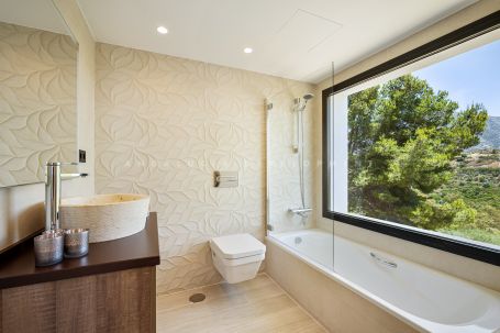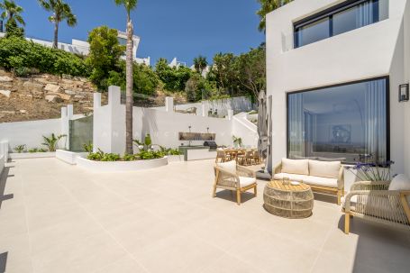 Una residencia mediterránea bellamente renovada, ubicada en el prestigioso enclave de Las Lomas de Nueva Andalucía. Orientada al sur y bañada por la luz natural, esta casa ofrece algunas de las vistas al mar más impresionantes de toda Nueva Andalucía. Distribuida en tres plantas, la casa cuenta con cinco dormitorios, uno de ellos actualmente utilizado como despacho, y está diseñada para combinar la elegancia del interior con el disfrute del exterior. El interior de la villa se define por suaves tonos neutros, materiales de alta gama y amplios espacios. El corazón de la casa es la sala de estar de planta abierta, conectada a la perfección con una elegante y moderna cocina y un comedor formal, todos con salida a amplias terrazas, perfectas para recibir invitados o simplemente disfrutar de las vistas. La suite principal se encuentra en la planta superior, ofreciendo máxima privacidad, además de un amplio vestidor y serenas vistas que se extienden hasta el mar Mediterráneo. La planta baja incluye una acogedora sala de estar, ideal como espacio de entretenimiento o sala de televisión.