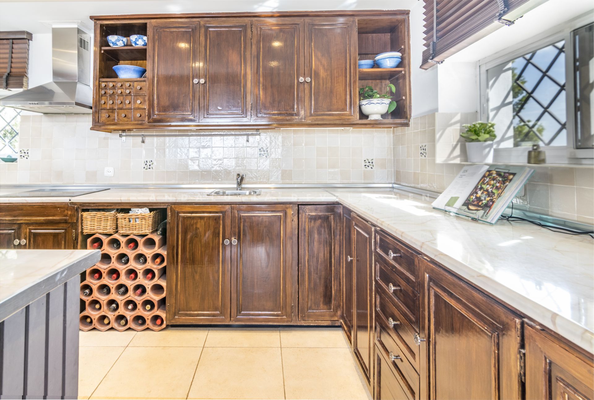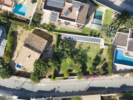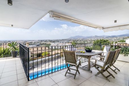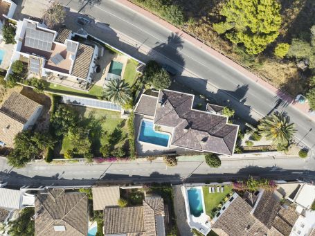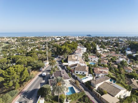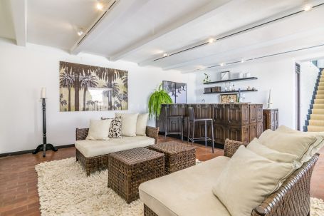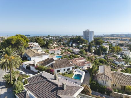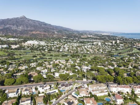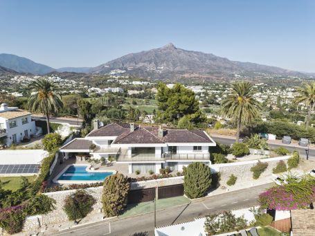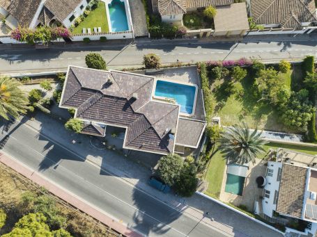 Encantadora villa a poca distancia de todos los servicios en Nueva Andalucía. Ubicada en una parcela de esquina cerca de Magna Marbella y el Club de Golf Los Naranjos, esta villa combina a la perfección elegancia y funcionalidad. Al entrar, le recibe un amplio vestíbulo que conduce a un luminoso salón con impresionantes vistas al valle y al mar Mediterráneo. A la izquierda de la entrada, se encuentra un aseo de cortesía. En esta misma planta, también hay un dormitorio principal con baño en suite. La cocina y el comedor son ideales tanto para cocinar como para recibir invitados, ofreciendo acceso directo a una terraza con cautivadoras vistas al mar, perfecta para cenas al aire libre y disfrutar de atardeceres con amigos y familiares. En la planta inferior, encontrará una segunda sala de estar con chimenea, un bar y un gran espacio adyacente que puede adaptarse a sus preferencias. Esta planta también incluye dos dormitorios de buen tamaño que comparten un baño. Al salir a la terraza privada, podrá disfrutar de una piscina y acogedoras zonas de descanso, algunas parcialmente cubiertas para mayor comodidad. Una habitación de invitados bellamente renovada con un amplio baño en suite ofrece privacidad y confort a sus visitantes. Para mayor practicidad, la propiedad cuenta con un gran garaje con espacio para varios coches, además de una amplia zona de almacenamiento/taller de más de 300 m². A la derecha de la villa se encuentra un jardín privado de 400 m² con árboles frutales y paneles solares, un lugar ideal para disfrutar del sol español. En el lado izquierdo, una zona más pequeña con más árboles frutales, una magnolia y un huerto donde podrá cultivar sus propios productos frescos. Esta villa destaca por sus múltiples áreas renovadas y ofrece un potencial ilimitado para adaptarse a su estilo de vida. Su ubicación única en esquina permite disfrutar de vistas panorámicas a La Concha al este, al valle y hacia el oeste, a las montañas y Gibraltar, ofreciendo espectaculares puestas de sol.