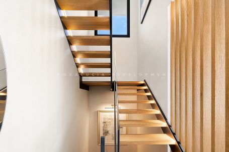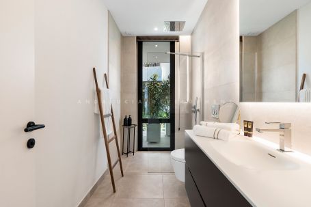 Esta impresionante y única casa moderna, construida recientemente y finalizada en 2022, ofrece una auténtica vida de lujo en una de las zonas más codiciadas de Marbella. Nada más entrar en la propiedad, se perciben las calidades de la misma. Una moderna cocina a medida con electrodomésticos Miele totalmente integrados le da la bienvenida, conectando con el salón-comedor de planta abierta, que se integra directamente con la amplia terraza, la piscina y el jardín. Gracias a su orientación sur/suroeste y oeste, la luz natural inunda la vivienda, realzada por los ventanales de suelo a techo. Se han utilizado exclusivamente las mejores marcas y materiales, como suelos de baldosas de Porcelanosa en el interior y el exterior, puertas y ventanas de terraza Cortizo con triple acristalamiento, herrajes de baño de Porcelanosa, calefacción por suelo radiante en toda la propiedad, aire acondicionado por zonas e iluminación domótica, sistemas de sonido y entretenimiento de calidad cinematográfica, carpintería de roble e iluminación ambiental, entre otros. La terraza principal y el jardín se integran armoniosamente entre el interior y el exterior, y aquí encontrará varias zonas exteriores para sentarse y relajarse. Un hermoso muro de piedra con iluminación ambiental integrada y plantas mediterráneas como hierbas aromáticas, naranjos, limoneros y limas crean un ambiente acogedor e íntimo. En la parte trasera, un jardín de fácil mantenimiento con magnolios ofrece vegetación y una fantástica vista panorámica de la propiedad. La piscina, estratégicamente ubicada, garantiza sol durante todo el día. Además, está climatizada y equipada con un sistema de corriente, lo que permite largos ilimitados para los nadadores más entusiastas.